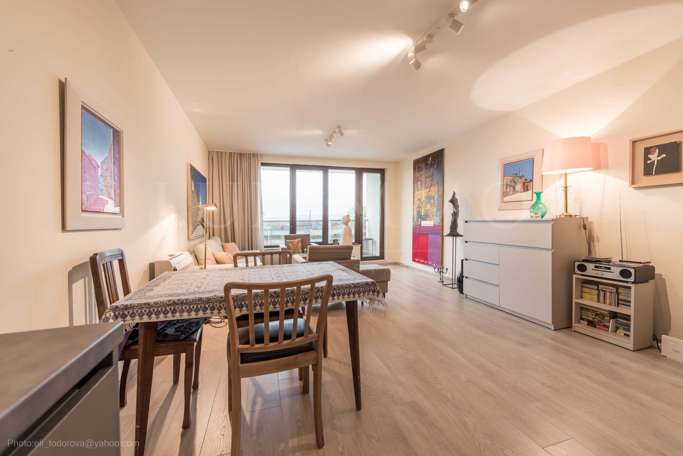 Имотът с обща площ от 87 кв.м е разположен на 5-и етаж от 7 в нова луксозно изпълнена сграда с контролиран достъп.