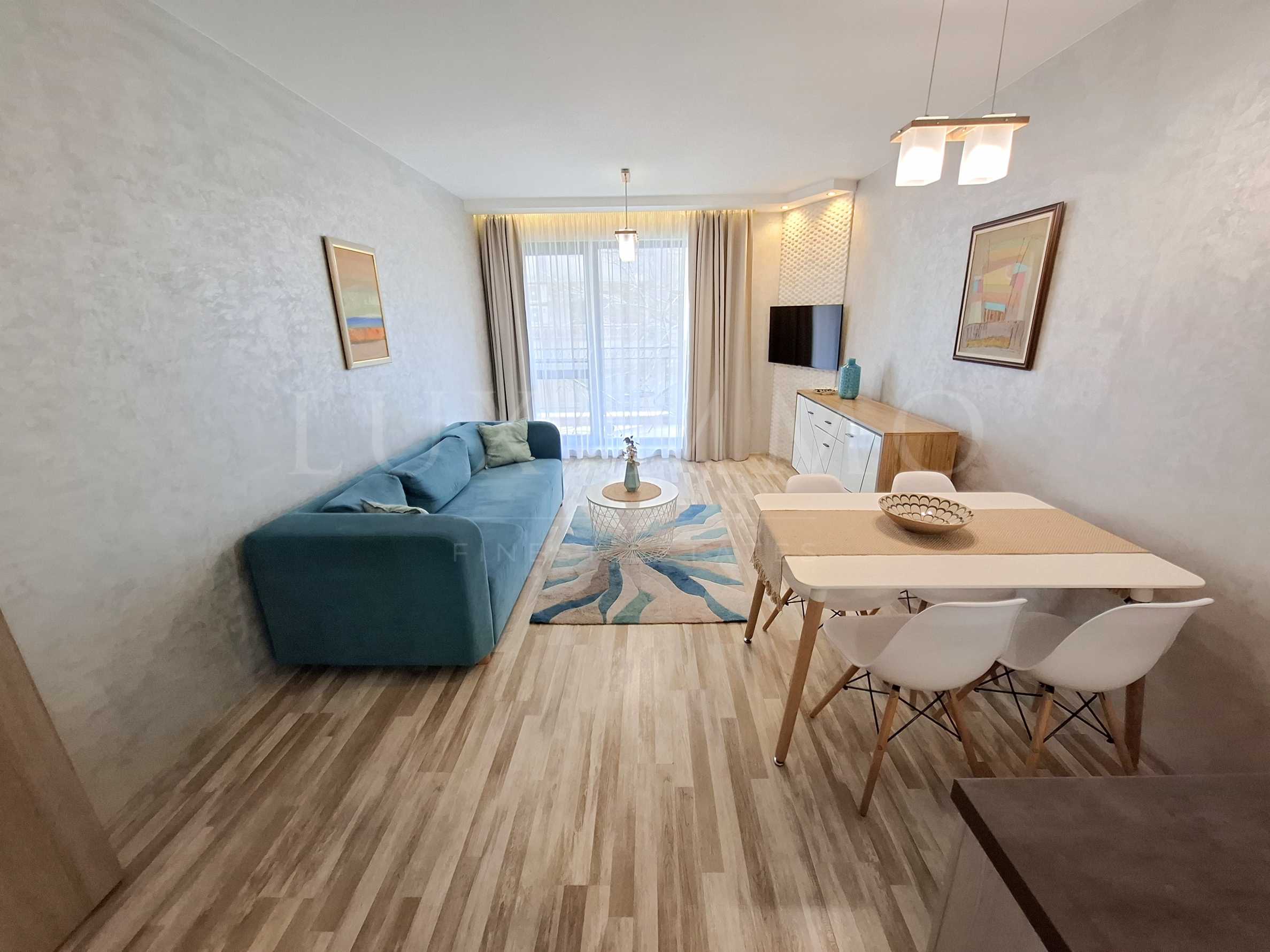 Апартаментът е модерно обзаведен и напълно оборудван с висок клас уреди - вградена фурна и плот с котлони, хладилник, бойлер, климатици и др.