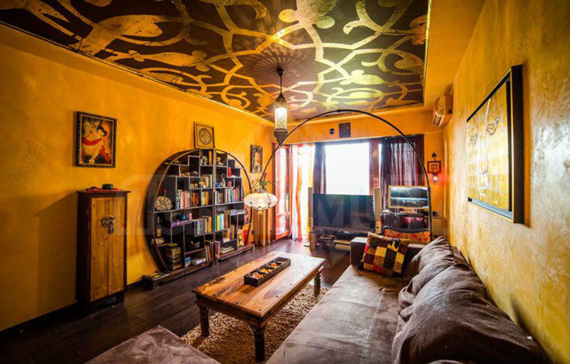 Този двустаен апартамент се намира на седми етаж на панелна жилищна сграда и има обща площ 60.9 кв.м. Състои се от хол, кухня с усвоена тераса, една спалня, баня, тоалет. Апартаментът е с вътрешна и външна изолация, а в спалнята освен изолация на стената има дървен паркет. Отоплението се осигурява от климатици в хола и кухнята. Апартаментът впечатлява с артистичен интериор, дизайнерско обзавеждане, богата орнаментика и детайли. Предлага се за продажба с мебелите, без картините. Възможно е договаряне със собственика относно кои мебели да останат и предоговаряне на цената.