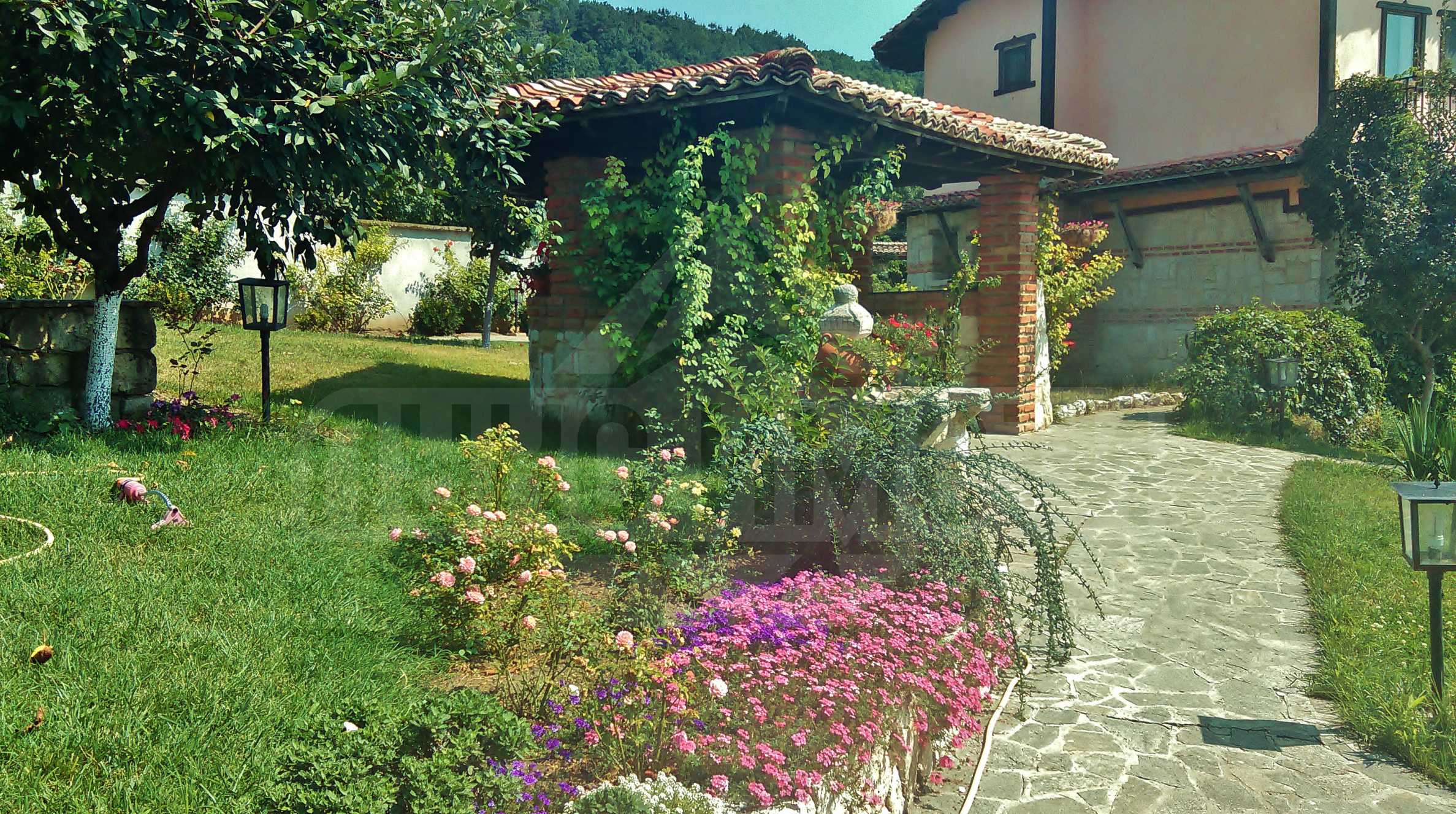 Покрай къщата дворът е с речен дребен камък, както и алеите с беседка в същия стил като и къщата, чешма и паркоместа. Дворът ще е озеленен с райграс, инсталирана е поливна система. Оградата на парцела е масивна. Има инсталирани сателитна телевизия, СОТ и интернет.