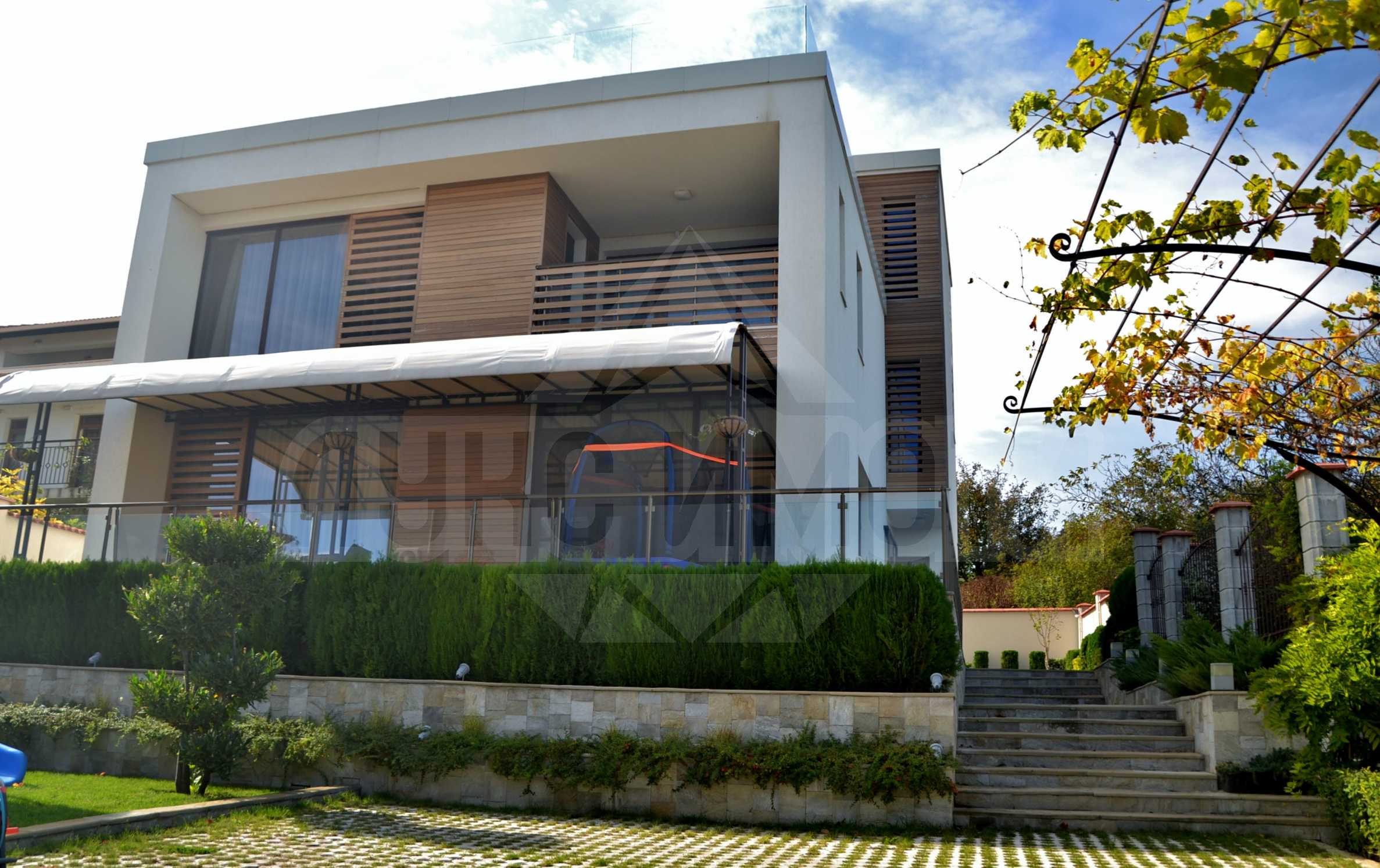 Тази уникална триетажна къща е завършена през 2011 г., без компромиси в качеството на материалите и в избор на обзавеждането, които отговарят на високите стандарти, определени от неговите собственици. Архитектурният проект е вдъхновен от модерни, минималистични идеи с изчистени прави линии, без излишни украси по екстериора. Интелигентното разпределение на пространството и френските прозорци във всичките жилищни помещения осигуряват максимална светлина, благодарение на прекрасното си местоположение и южно изложение. Дворът е добре поддържан и разполага с детска площадка, декоративни растения и масивна ограда. Сигурността и спокойствието на собствениците се осигуряват от модерни системи за сигурност, инсталирани в имота.