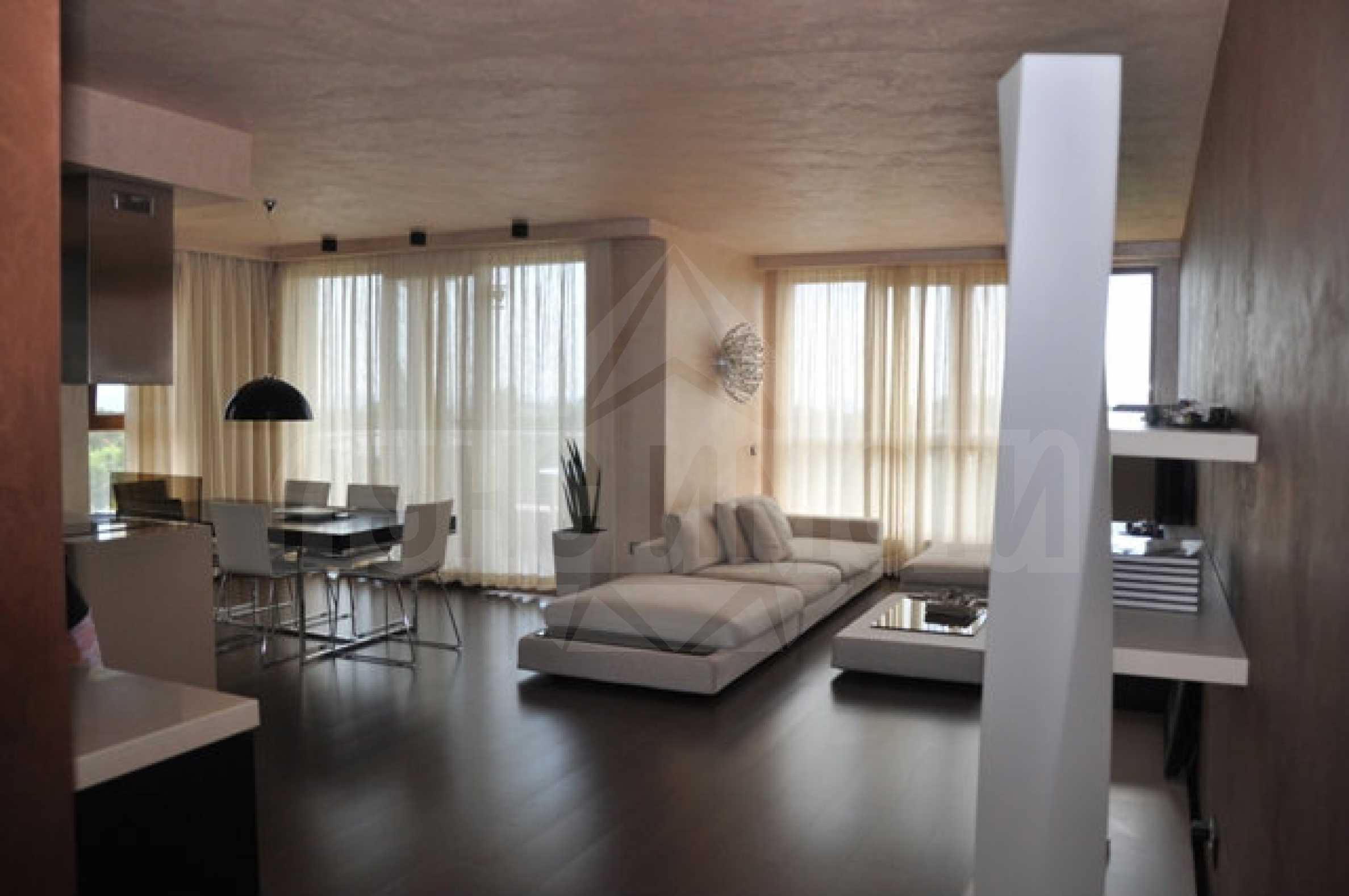 На площ от 135 кв.м. са разположени: две спални, две санитарни помещения, антре, просторна и слънчева дневна и кухня с вградени електроуреди и три тераси. Жилището се продава напълно обзаведено и оборудвано, климатици, СОТ и др.