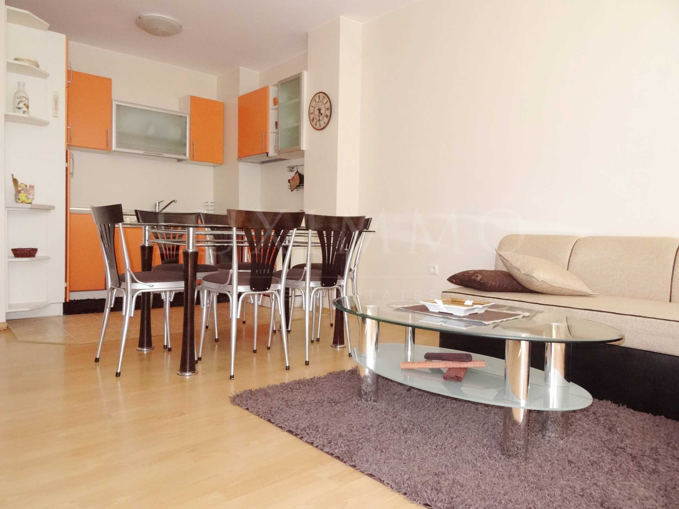 Апартаментът се намира на 2 етаж в 4-етажна тухлена сграда без асансьор и е с площ 103 кв.м. Състои се от дневна с кухня (печка, съдомиялна, хладилник, посуда), излаз на слънчева тераса; две спални (родителска и детска), антре, санитарен възел с душ-кабина. В банята е монтирана пералнята. Към родителската спалня има тераса.