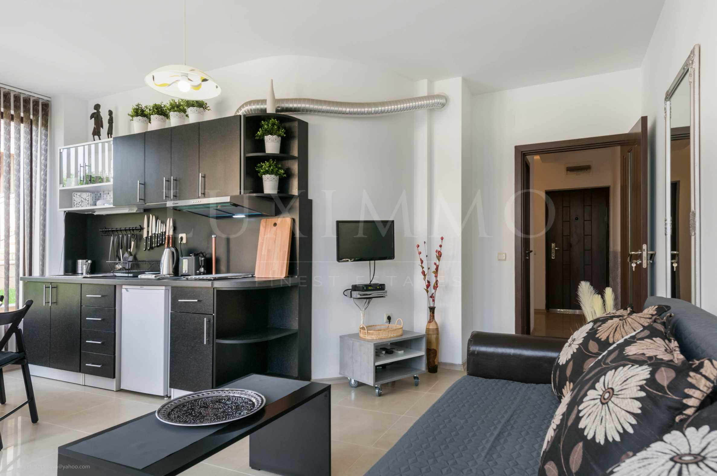Апартаментът е разположен в нова сграда с прекрасно озеленен двор с различни декоративни дръвчета, басейн с външен душ и барбекю зона.