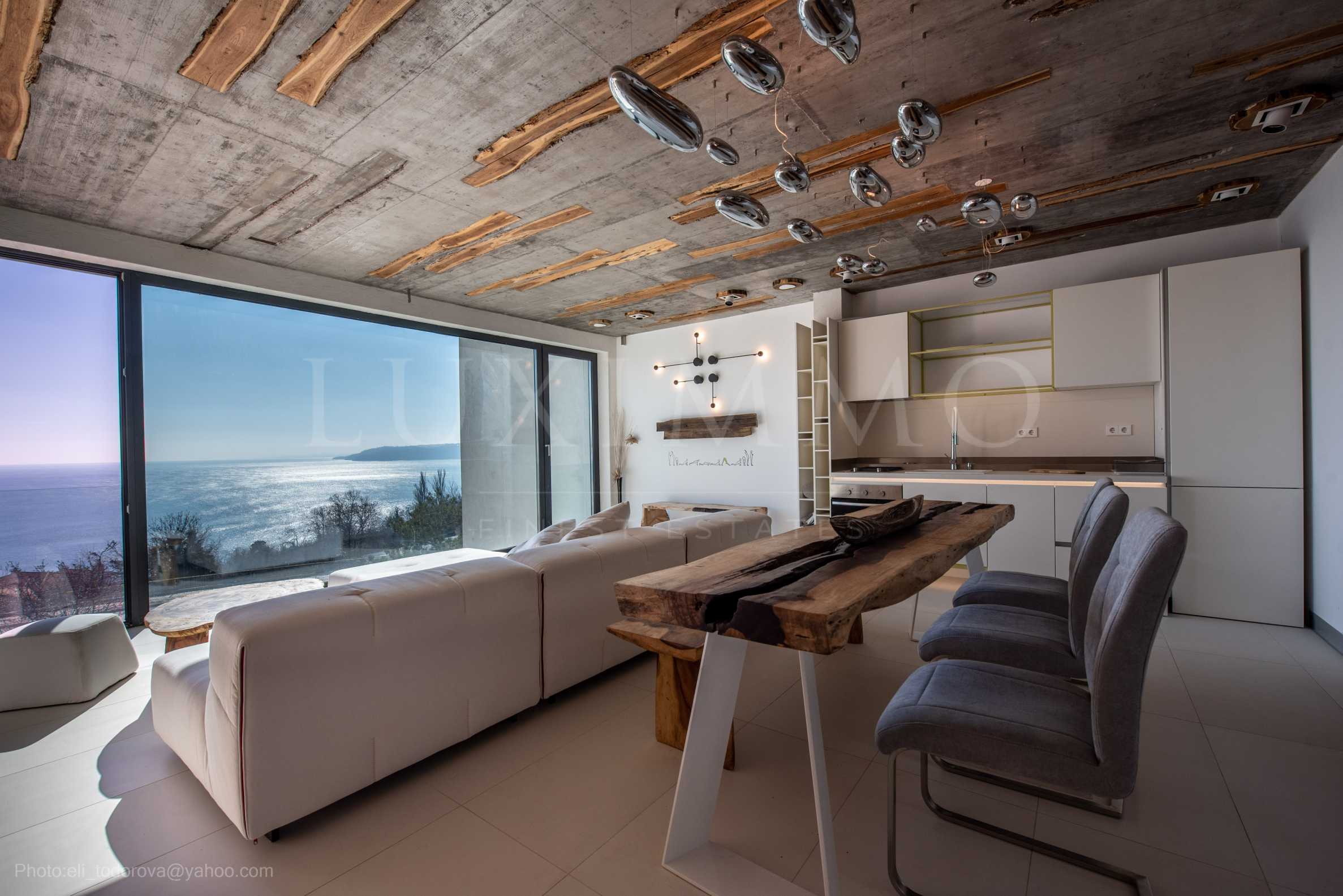 Дизайнът е уникален - естествен и модерен, предизвикателен и светъл, носещ посланието на автономност, релакс и морската атмосфера. В бетоновите плочи по тавана на апартамента са вградени естествени дървени орнаменти от акация. Тухлените стени и бетонът са използвани за естествена декорация, като са допълнително обработени, импрегнирани и грундирани. Мебели, кухня, матраци и дивани, атрактивни плочки, осветителни тела - всички са на известни италиански марки. Вниманието в трапезария е с акцент на екстравагантната маса, изработена по поръчка, от ценно и рядко дърво от Амазонка. Банята е отделена със стъклена врата, за изобилието на слънчева светлина, а всички санитарии са първокласно немско качество.