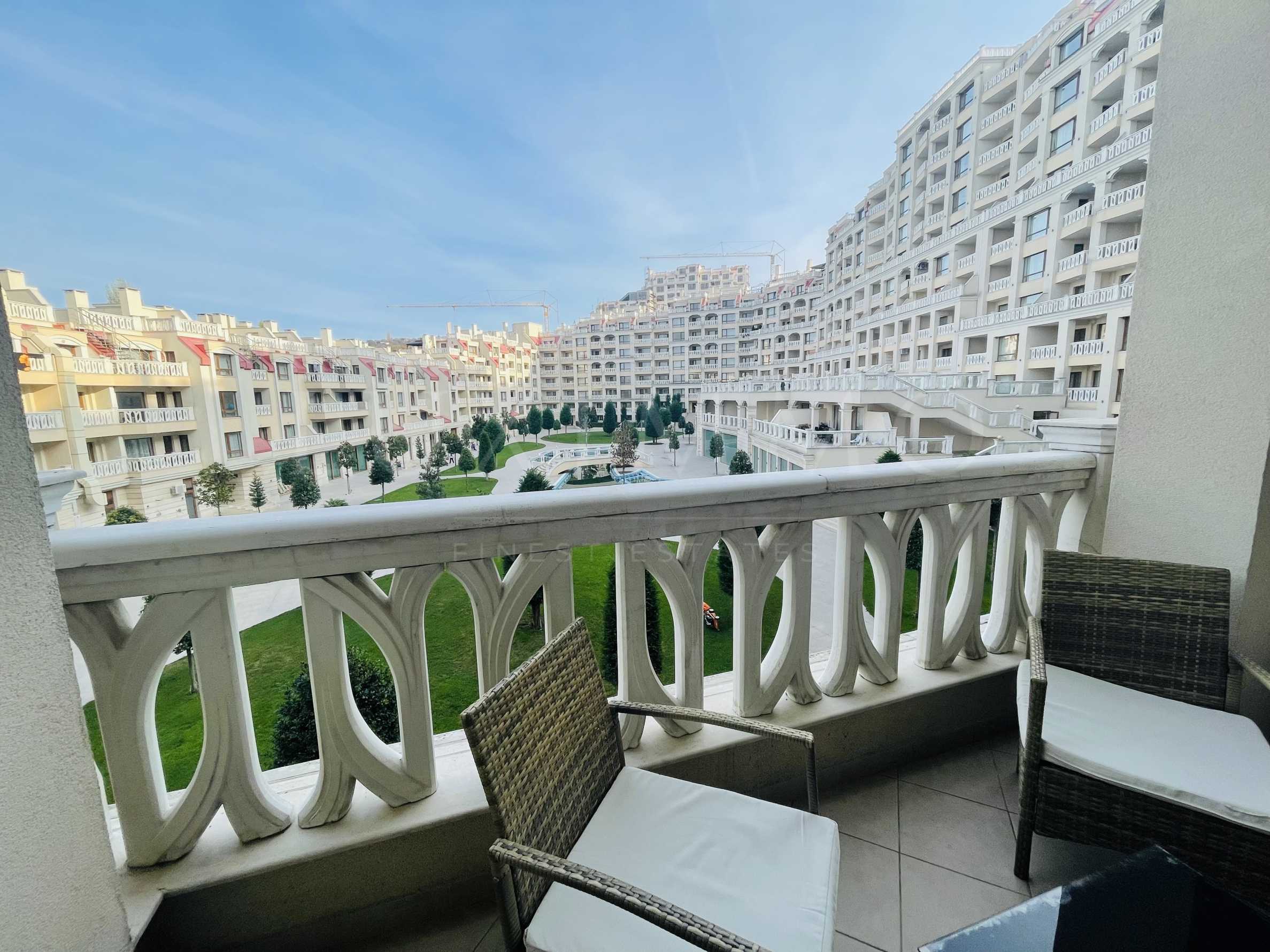 Апартаментът е качествено мебелиран, готов за нанасяне. Имотът е разположен на 2-ри етаж и има обща площ от 87.88 кв.м: антре с коридор, килер, всекидневна с добре оборудвана кухня, голяма тераса с гледка към басейна, две спални, втора тераса към спалните, баня с душ кабина.