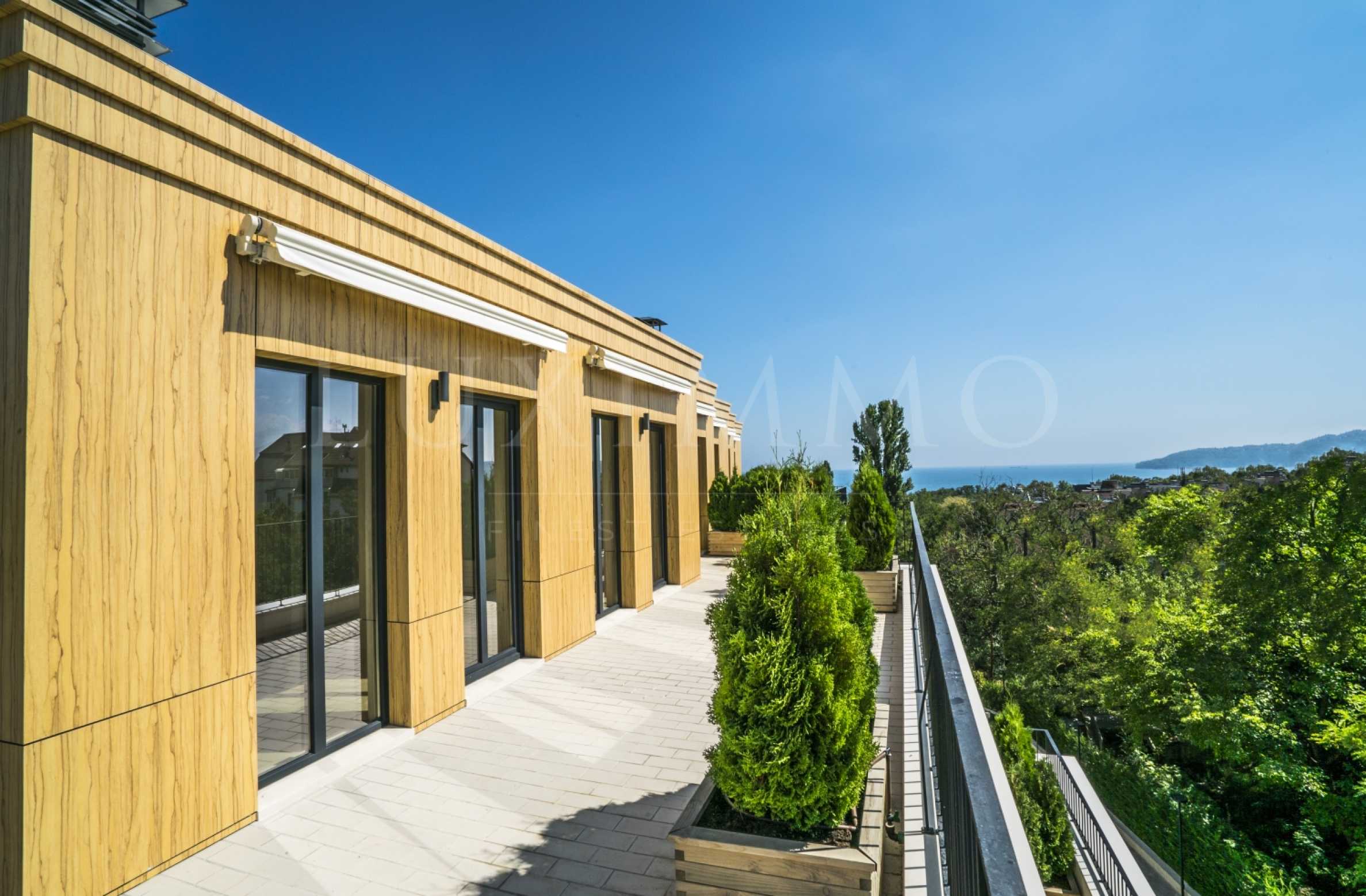 Апартаментът е разположен на 5-и етаж от 5 и има 11.78 кв.м тераси. Състои се от две спални, две бани, удобен коридор, дневна с кухня, две обширни тераси.
