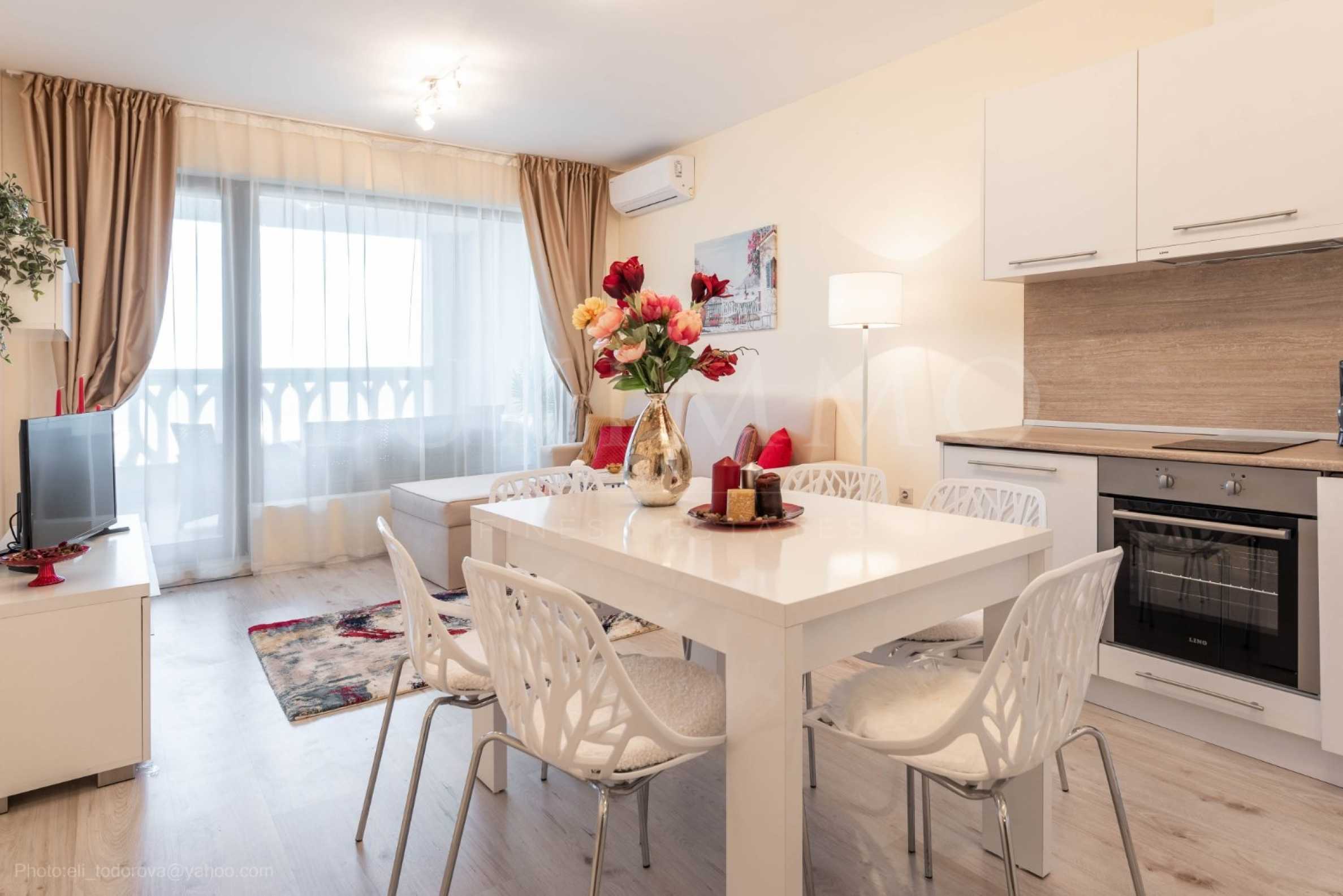 Имотът е съвременно и стилно мебелиран, с приятен светъл интериор, качествени електроуреди, с всичко необходимо за живеене.