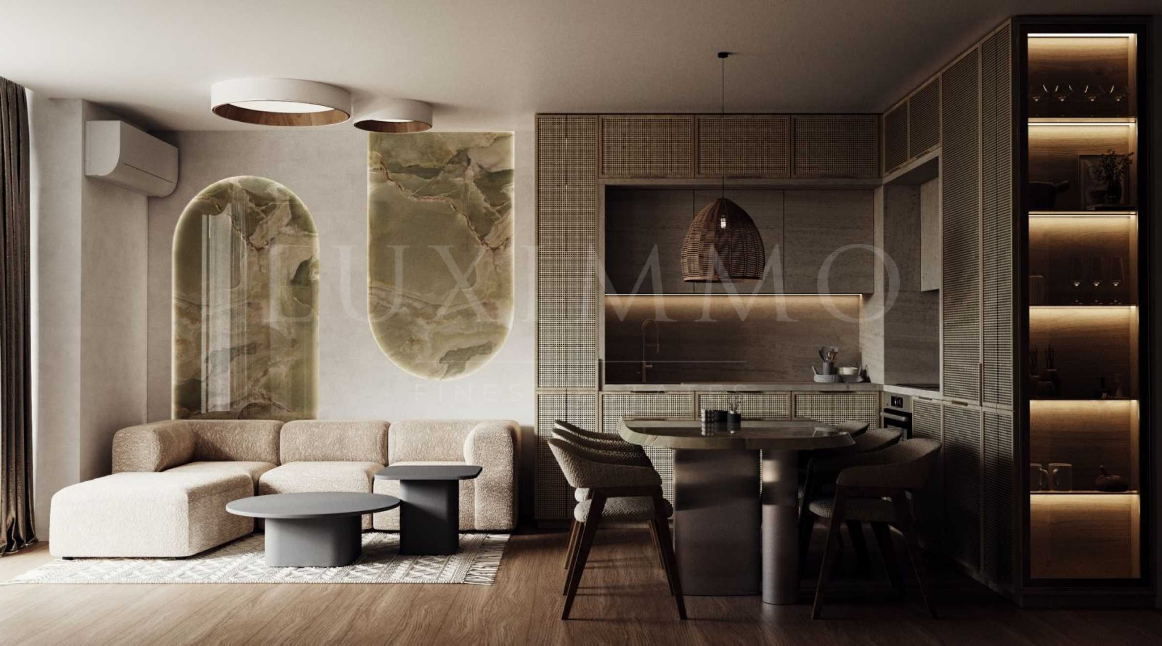 Изложението на дневната е запад, а на спалните - изток. Собственикът е направил индивидуален дизайнерски проект за довършитени работи и обзавеждане, който ще бъде предоставен на купувачите на апартамента.