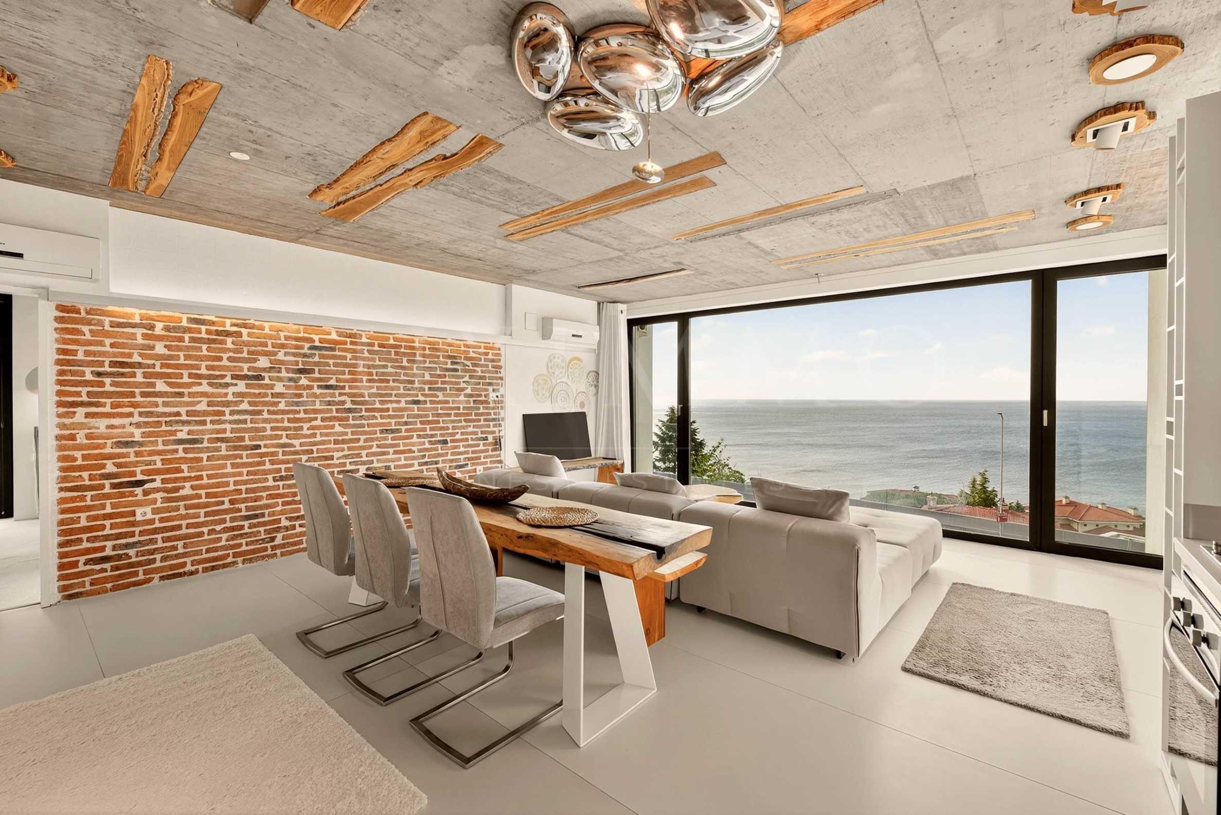 Дизайнът е уникален - естествен и модерен, предизвикателен и светъл, носещ посланието на автономност, релакс и морската атмосфера. В бетоновите плочи по тавана на апартамента са вградени естествени дървени орнаменти от акация. Тухлените стени и бетонът са използвани за естествена декорация, като са допълнително обработени, импрегнирани и грундирани. Мебели, кухня, матраци и дивани, атрактивни плочки, осветителни тела - всички са на известни италиански марки. Вниманието в трапезария е с акцент на екстравагантната маса, изработена по поръчка, от ценно и рядко дърво от Амазонка. Всички санитарии в банята са първокласно немско качество.