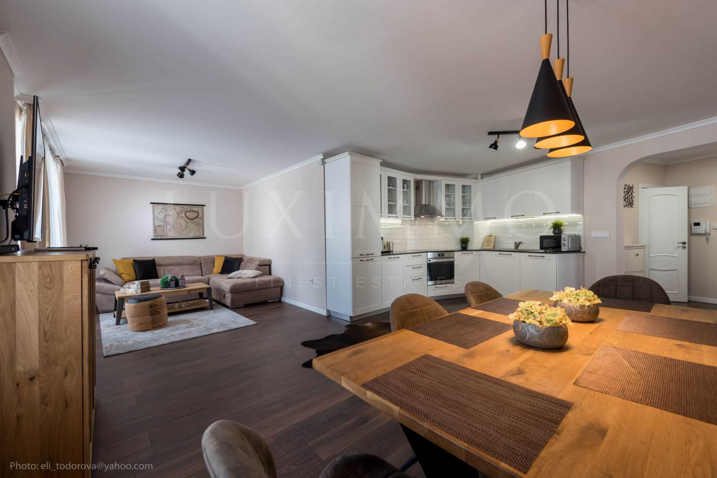 Апартаментът е след освежителен ремонт, модерно обзаведен и напълно оборудван с висок клас уреди - вградена фурна и плот с котлони, хладилник, бойлер, три климатика и др.