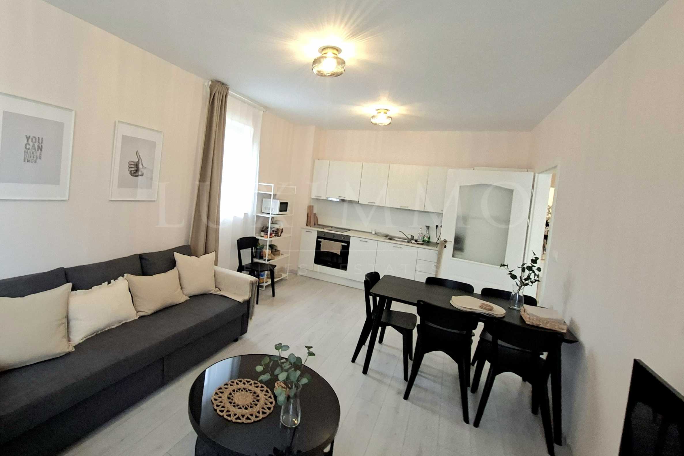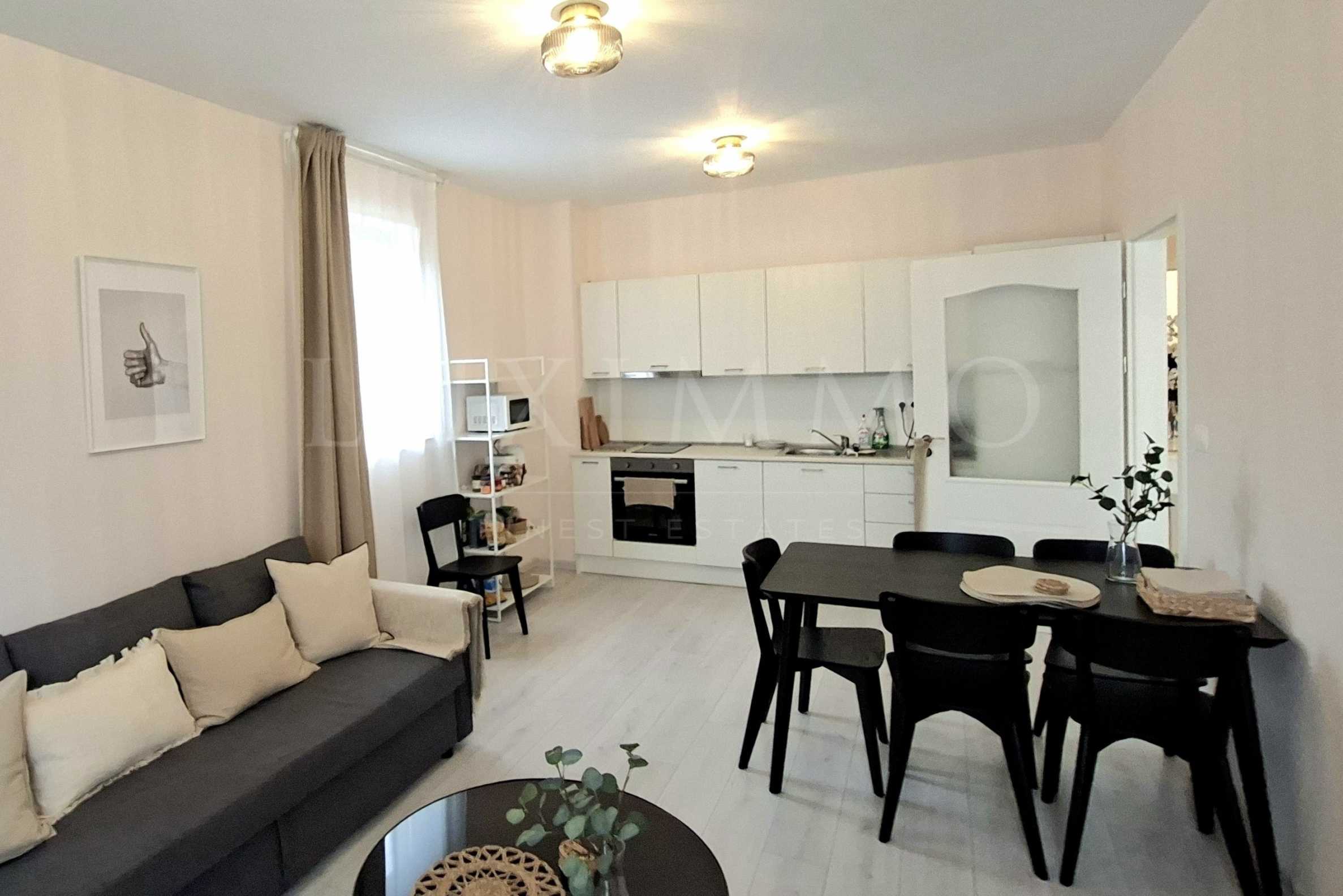 Апартаментът е напълно обзаведен и оборудван с всичко необходимо за живеене като качествени мебели и ел. уреди, с внимание към всеки детайл.
