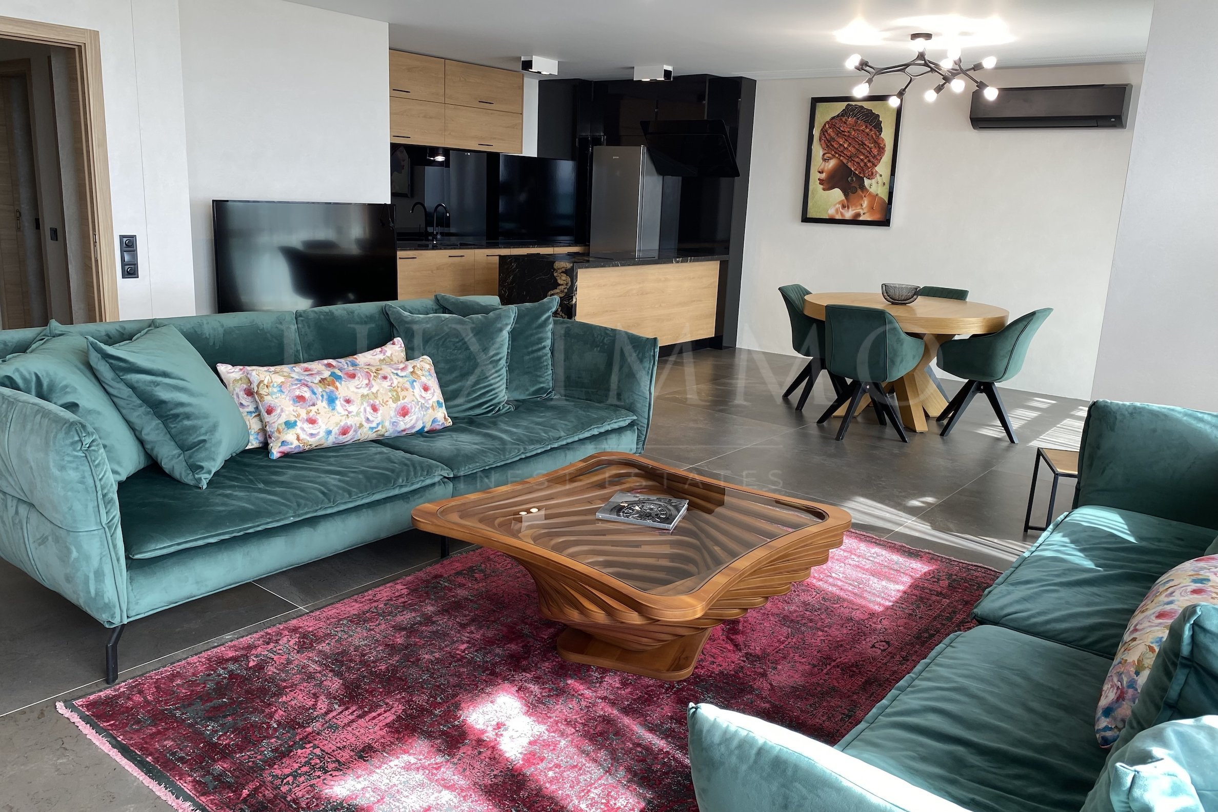Апартаментът е луксозно обзаведен с висок клас мебели и качествени материали. Интериорът се отличава със стилни и модерни решения, внимателно подбрани детайли и усещане за елегантност. Голямата площ и високият етаж допринасят за изключителен простор и светлина във всяко помещение.