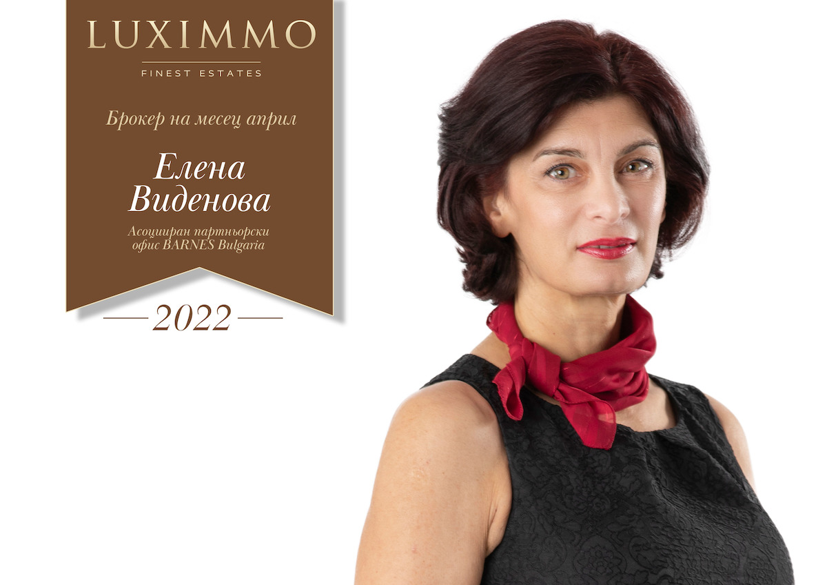 Като специалист в продажбите на имоти в най-високия сегмент на пазара, Елена Виденова заслужено получава титлата „Брокер на месеца“ за април. Елена е безупречен професионалист, който подхожда креативно към всеки казус и прилага отлични комуникативни умения, за да могат клиентите ѝ да получат професионално обслужване през целия етап на сделката. Вижте цялото портфолио на Елена Виденова тук!