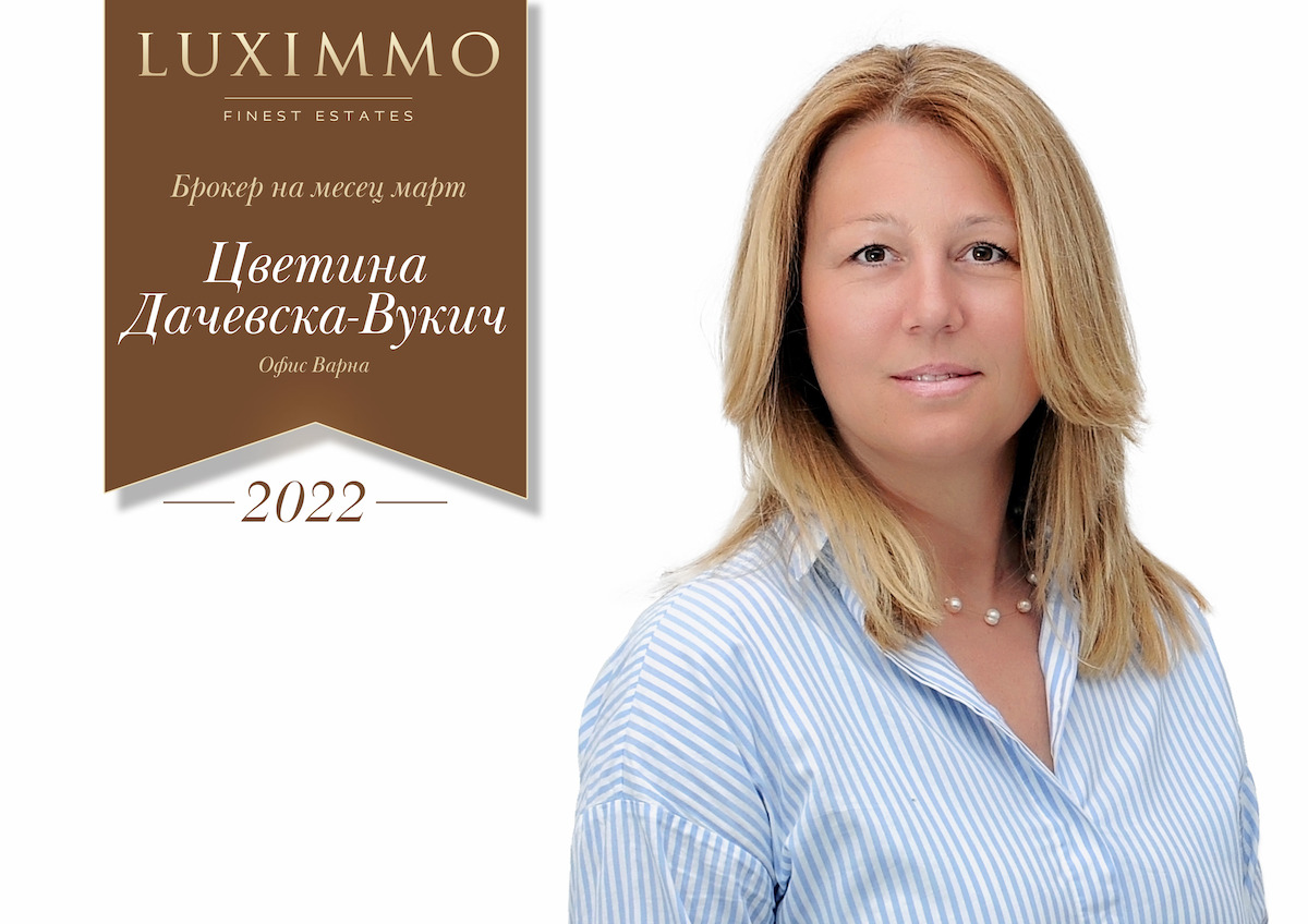 Поздравления за Цветина Дачевска-Вукич от офис Варна, чиято отдаденост към професията ѝ отреди място сред най-успешните брокери за месеца. Тя вярва, че правилният подход и проявеното разбиране са ключа към успешното сключване на сделка с имот. Именно нейната съпричастност с нуждите на клиента оправдава очакванията на хората, избрали я за свой консултант. Вижте цялото ѝ портфолио тук!