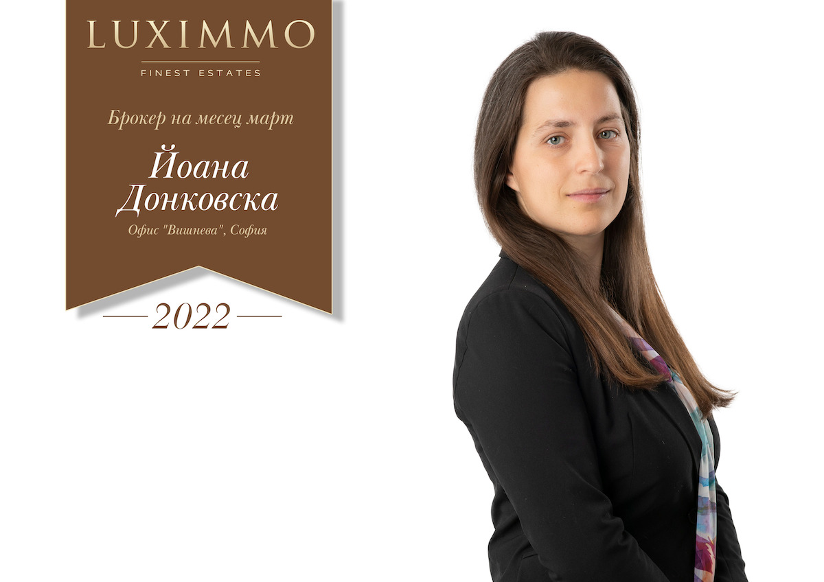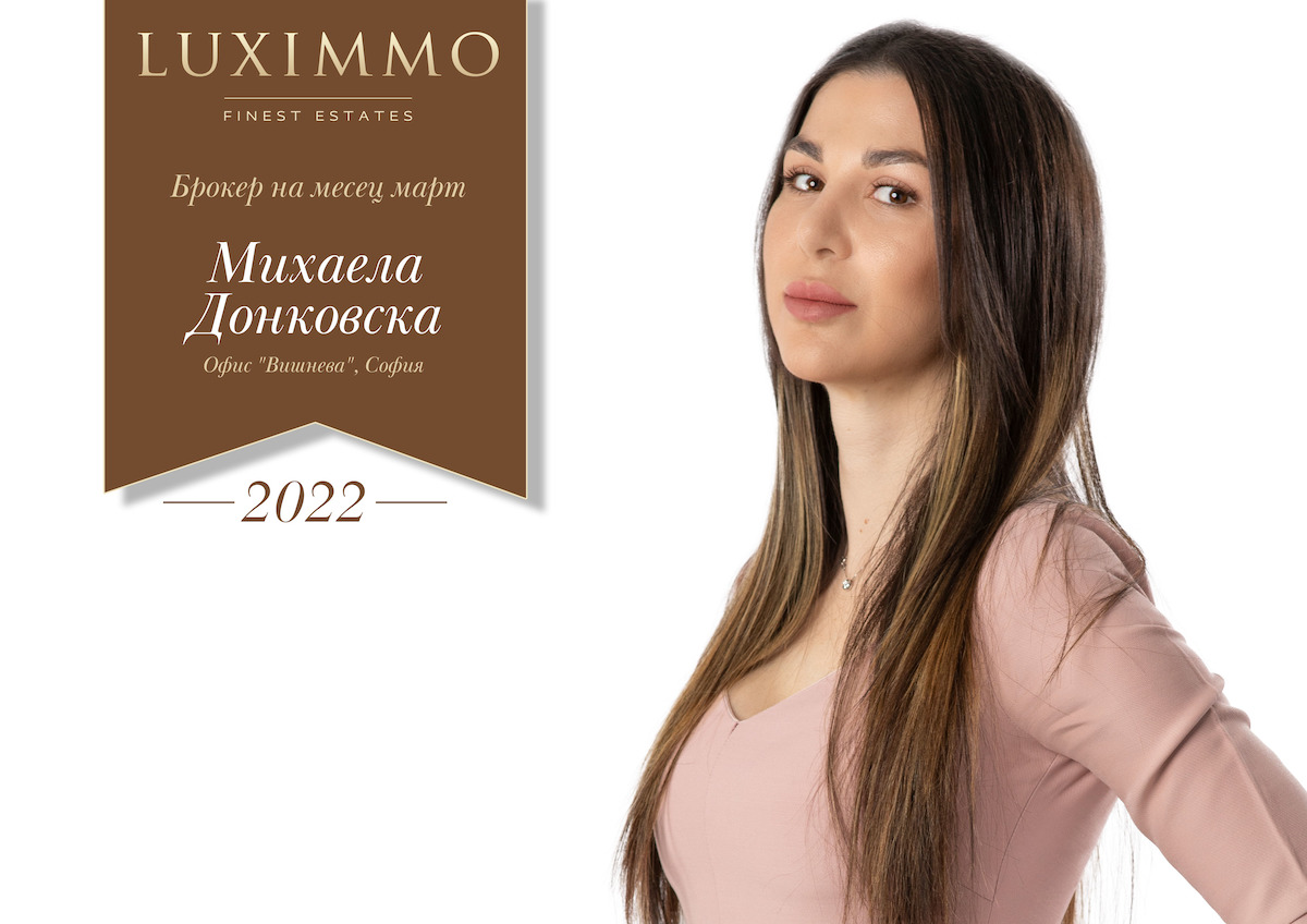 Михаела Донковска продължава да постига забележителни резултати и през месец март. Тя винаги съумява да селектира атрактивни имоти за своето портфолио, които в нейни ръце бързо откриват своите нови собственици. В нейно лице ще откриете верен посредник, зареден с търпение към всички Ваши въпроси и амбиция да помогне в откриването на точния имот за Вашите нужди. Всичко това ѝ помага да защитава стандарта Luximmo пред всеки свой клиент.