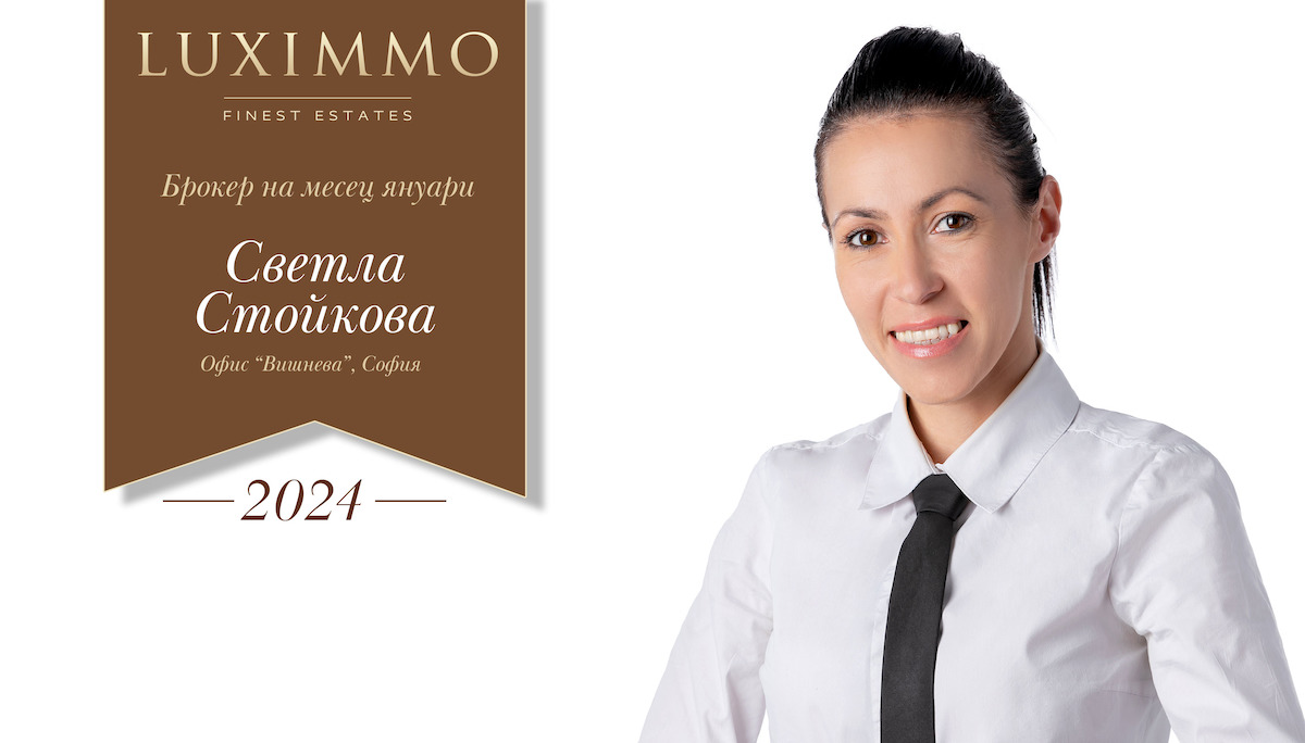 Паолина Желязкова е едно от разпознаваемите лица на LUXIMMO и един от консултантите, които непрестанно изумяват със стабилно високи нива на продажби, и изминалия месец не е изключение. Паолина ясно заявява намеренията си за силна 2024 година, не губи време и дава максимума от себе си, за да намери най-подходящия дом за Вас и тези, които обичате. Запознайте се с цялото й портфолио тук!