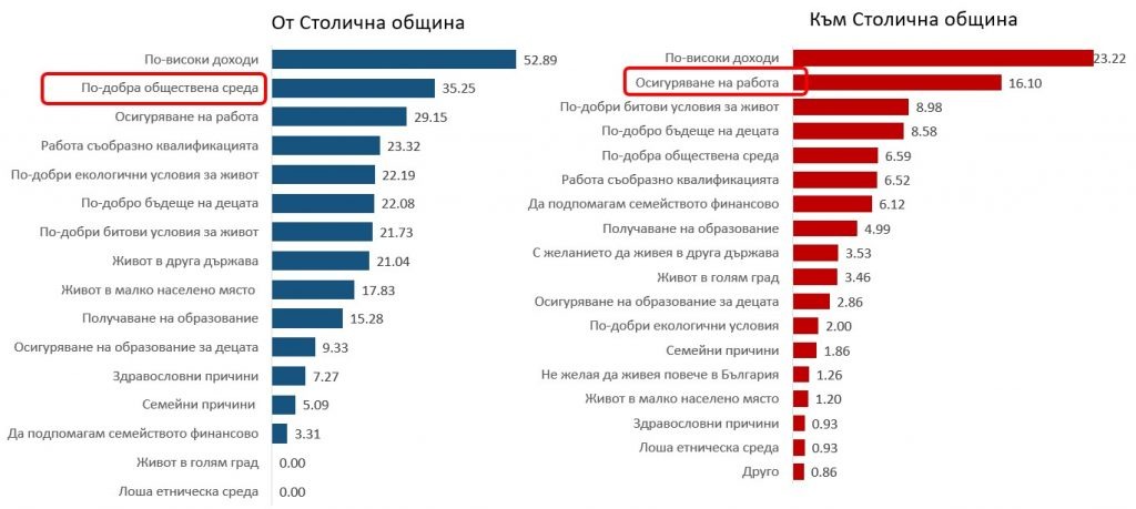 Най-често посочваната причина за напускане на населените места в Столична община е осигуряването на по-високи доходи. Това е основание за бъдеща миграция на близо 57% от потенциалните емигранти. Втората посочвана причина е намирането на работа - тя е стимул за 33 процента.