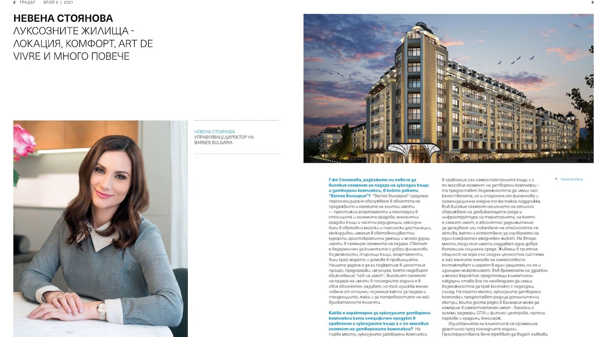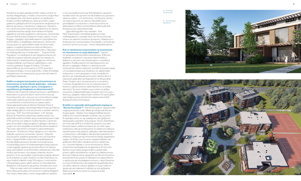 Търсят се предимно естествени материали. В Barnes казваме, че домът е нашата трета кожа, а кожата е нашият най-голям орган и неговото здраве е в зависимост от материалите, от които е изграден. Важен е и екологичният отпечатък, който имотът оставя в големия град и в голямата картина. Колкото по-ефективен енергийно и оптимизиран е той, толкова по-желан е за информирания клиент, който вече е сериозно загрижен за бъдещето на общия дом Земя. Голяма част от днешните ни клиенти с големи възможности са от поколението Y, което е изключително чувствително на тема екология. За него е важно наличието на добра социална инфраструктура, близост до училища и болници, градски транспорт, който те използват над традиционно приетите ограничения във възприятията в България. В какво се изразява ексклузивният подход на "Barnes България"? "Barnes България" предоставя подход на много нива. Може да обединим всички в една дума – време. Ние предоставяме много повече от нашето време на всеки наш клиент. В портфолиото ни ще намерите най-добрите ексклузивни проекти в България. Почти във всеки от тях има ДНК-то на Barnes, защото ние сме консултирали инвеститора още на ниво идея, помогнали сме за селекцията на правилна локация, проектирали сме заедно, избирали сме материали и технологии, обсъждали сме финансирането на обекта и бъдещия му отпечатък върху градската среда. На всеки наш клиент предоставяме най-добрите световни професионални практики, но и нашето време и лично отношение. Като страстен привърженик на френския Art de vivre Barnes също така предоставя широка гама услуги извън купуването на дом или ваканционно жилище. Компанията предлага на своите клиенти консултантски услуги в сферата на изкуството и имотите за отглеждане на вино и чрез богатия си опит в областта им помага в придобиването на ловни имения и конни ферми, а също така се грижи да им помогне в избора на най-добрата ваканционна вила, яхта или сезонна хижа под наем.