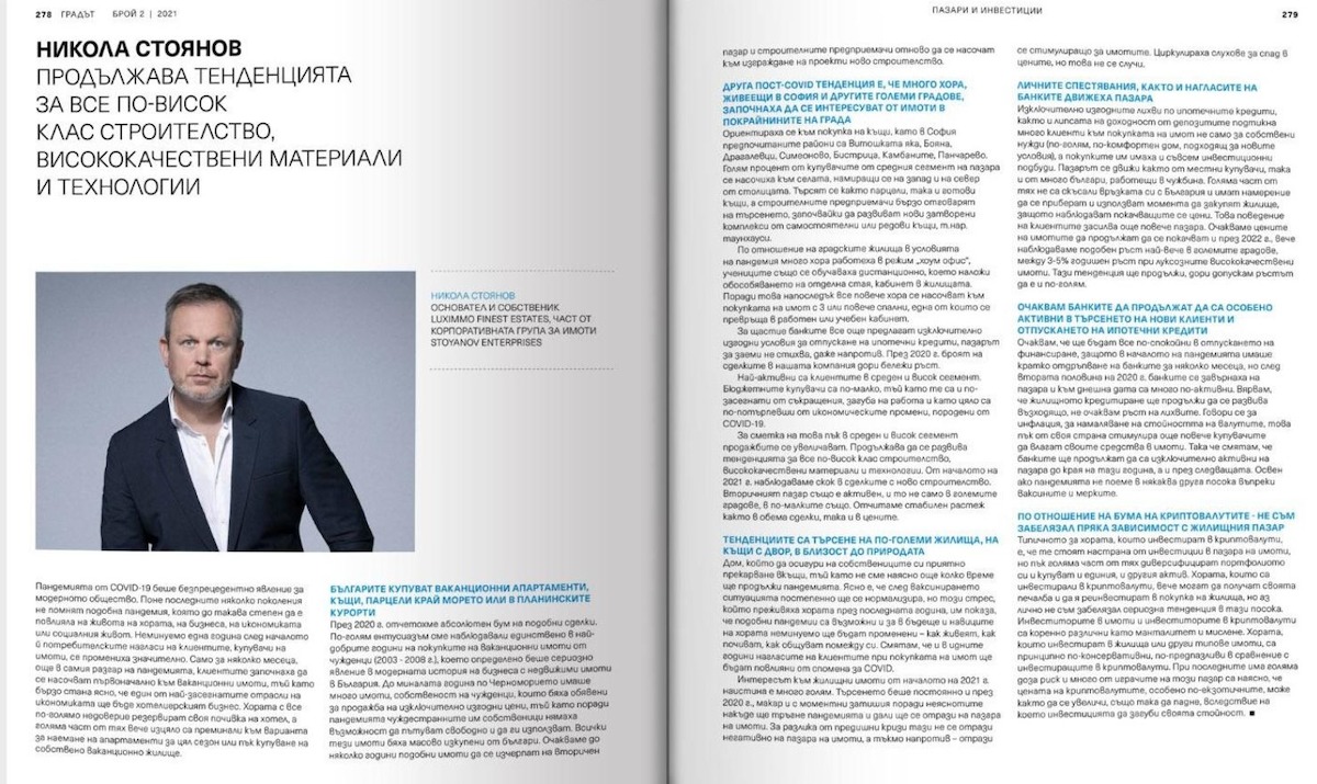 Ориентираха се към покупка на къщи, като в София предпочитаните райони са Витошката яка, Бояна, Драгалевци, Симеоново, Бистрица, Камбаните, Панчарево. Голям процент от купувачите от средния сегмент на пазара се насочиха към селата, намиращи се на запад и на север от столицата. Търсят се както парцели, така и готови къщи, а строителните предприемачи бързо отговарят на търсенето, започвайки да развиват нови затворени комплекси от самостоятелни или редови къщи, т.нар. таунхауси. По отношение на градските жилища в условията на пандемия много хора работеха в режим „хоум офис“, учениците също се обучаваха дистанционно, което наложи обособяването на отделна стая, кабинет в жилищата. Поради това напоследък все повече хора се насочват към покупката на имот с 3 или повече спални, една от които се превръща в работен или учебен кабинет. За щастие банките все още предлагат изключително изгодни условия за отпускане на ипотечни кредити, пазарът за заеми не стихва, даже напротив. През 2020 г. броят на сделките в нашата компания дори бележи ръст. Най-активни са клиентите в среден и висок сегмент. Бюджетните купувачи са по-малко, тъй като те са и по-засегнати от съкращения, загуба на работа и като цяло са по-потърпевши от икономическите промени, породени от COVID-19. За сметка на това пък в среден и висок сегмент продажбите се увеличават. Продължава да се развива тенденцията за все по-висок клас строителство, висококачествени материали и технологии. От началото на 2021 г. наблюдаваме скок в сделките с ново строителство. Вторичният пазар също е активен, и то не само в големите градове, в по-малките също. Отчитаме стабилен растеж както в обема сделки, така и в цените.