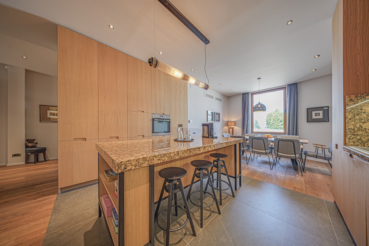 Партерният етаж впечатли с модерна концепция – всекидневна, трапезария и кухня в отворен план, обединени от топли земни тонове и висок клас естествени материали. Централният кухненски остров се превърна в естествена точка на събиране, вдъхновяваща разговори и кулинарни идеи, а камината на дърва добави завършен щрих на уют и домашна топлина.