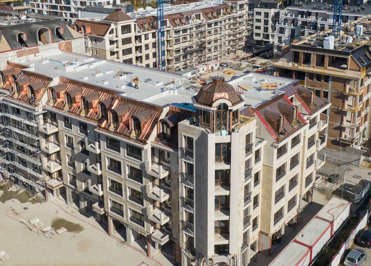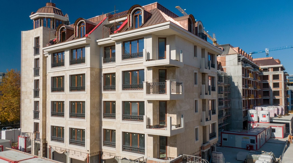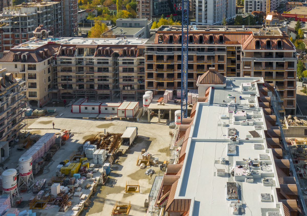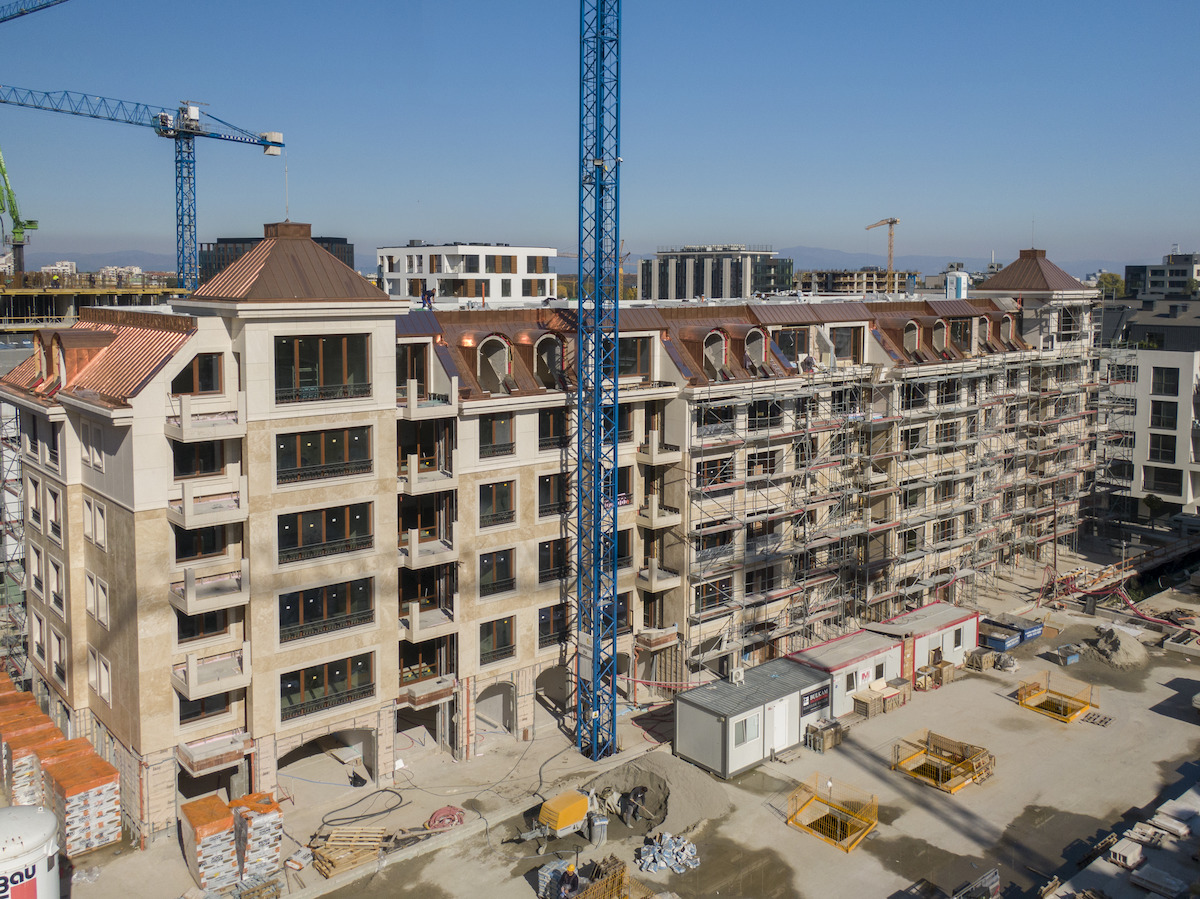 Изграждането на Paradise Place се случва в обявените срокове и комплексът вече започва да разкрива впечатляващия си облик - вентилируема окачена фасада с облицовка от травертин и варовик, медни покриви, дървена дограма с трислойно слепен селектиран профил „Muenchinger“.