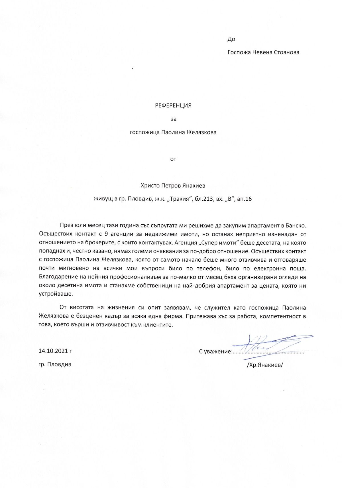 Мы благодарим нашего консультанта Паолину, за четкую и профессионально выполненную работу по продаже апартамента в Банско. Несмотря на то что, мы не были лично знакомы и сделка проводилась удаленно, всё было сделано четко и грамотно. Еще раз спасибо за профессионализм, умение работать с клиентом и за оправданные надежды.