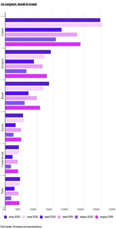 През март делът на София, Пловдив, Варна, Бургас, Русе и Стара Загора при покупко-продажбите се движеше около 41% от всички. През април нарасна до 45%, през май пада на 37.5%, а през юни отново се качи до 38.24%. Това показва, че макар през май да се наблюдаваха признаци за оживление на пазара извън шестте големи града на страната, възстановяването през юни се държи основно на активността в големите градове.