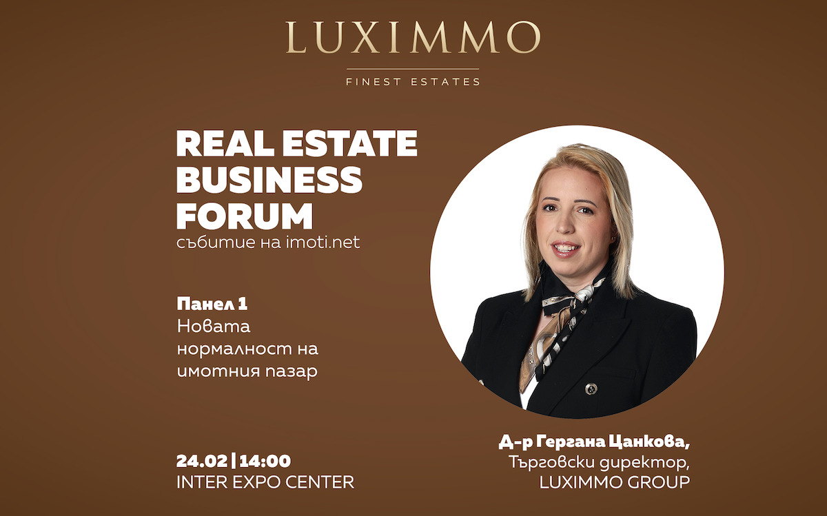 Търговският директор на LUXIMMO Group Гергана Цанкова ще бъде един от участниците в предстоящото 11 издание на едно от най-големите в сферата на недвижимите имоти събития - REAL ESTATE BUSINESS FORUM, организирано от imoti.net.