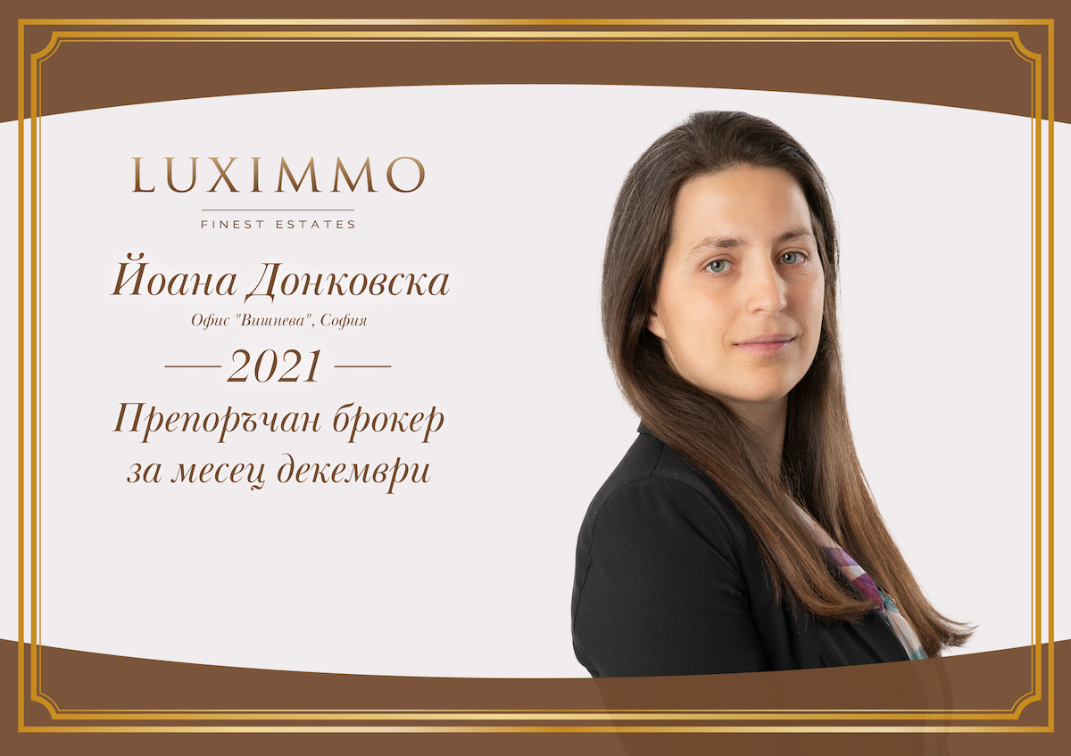 Йоана Донковска е носител на титлата Брокер на годината за 2020 година, утвърден специалист в продажбите на имоти ново строителство и наложено лице сред редиците на Luximmo.