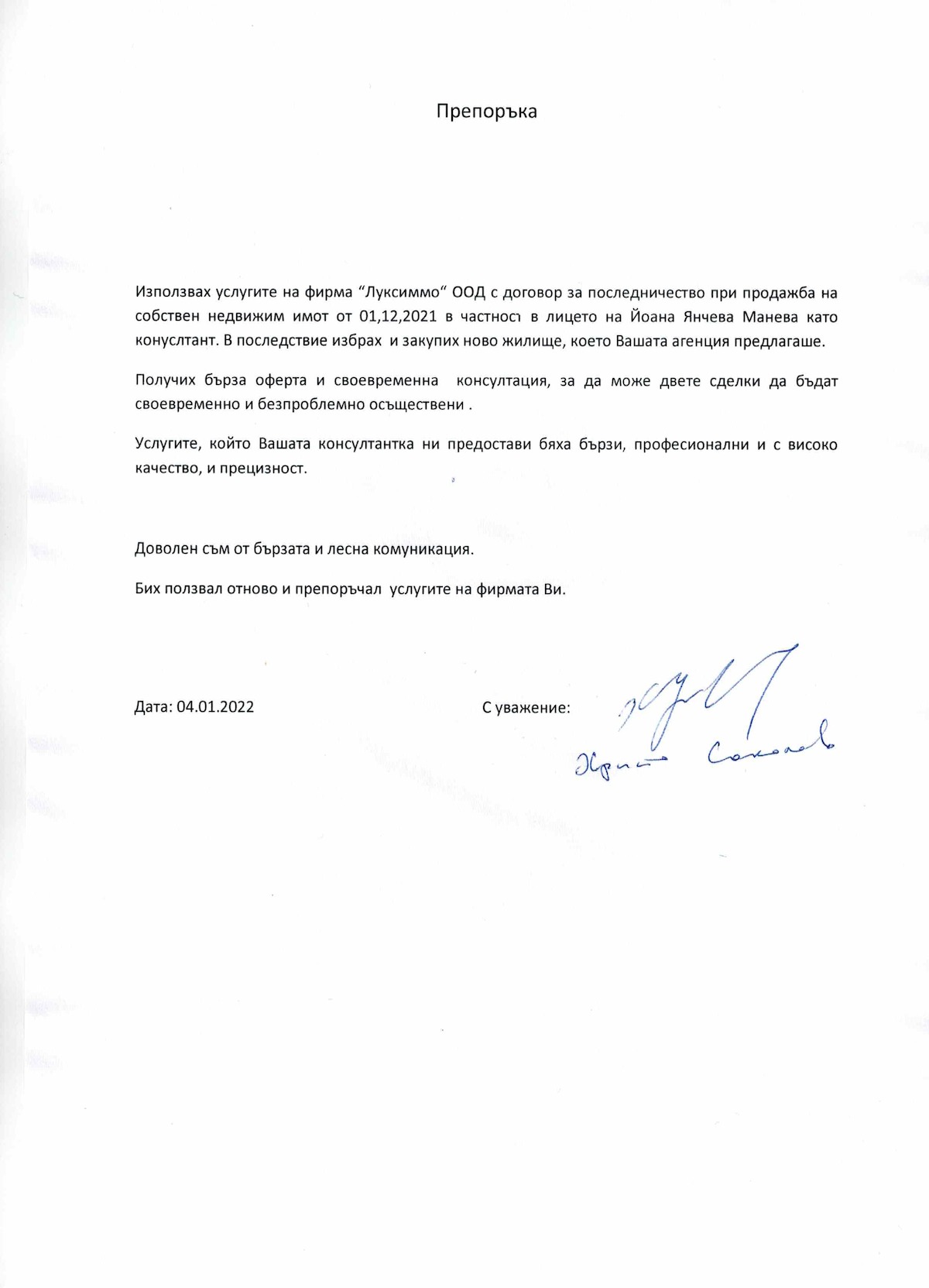 "Използвах услугите на фирма „Луксиммо“ ООД с договор за посредничество при продажба на собствен недвижим имот от 01.12.2021 в частност в лицето на Йоана Янчева Манева като консултант. В последствие избрах и закупих ново жилище, което Вашата агенция предлагаше.