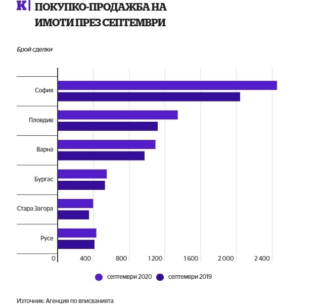 В София и Пловдив увеличението е с по 20% съответно до 2450 сделки за столицата и 1343 за Града по тепетата.