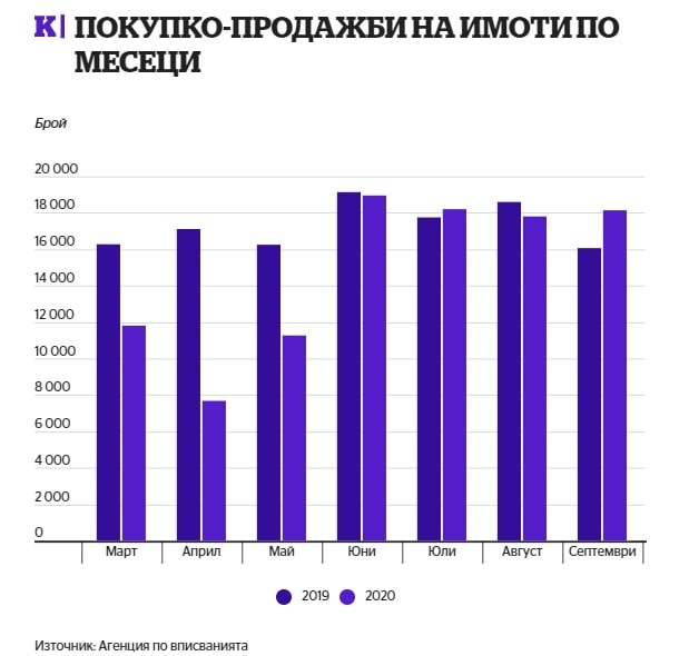 Общо за деветте месеца на годината в страната са вписани 113 265 покупко-продажби, което е с 23% по-малко от регистрираните 147 609 през същия период на 2019 г.