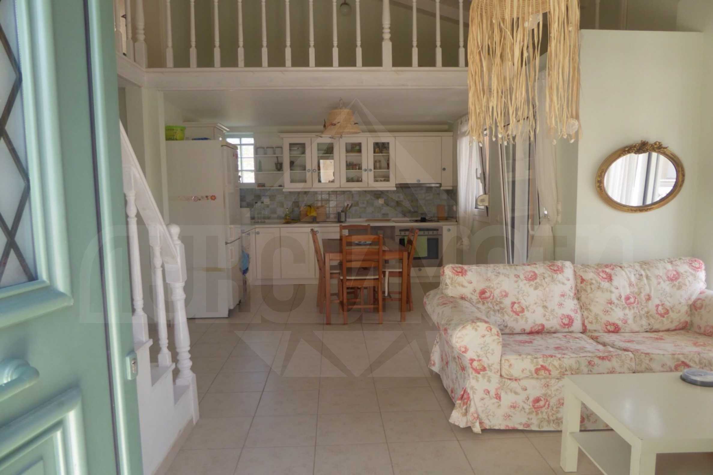 Приятна и модерна къща на два етажа, разположена в спокоен район на ръкава Ситония, част от полуостров Халкидики. Къщата е построена през 2010 година и е на два етажа. Тя се простира на площ от 100 кв.м., като е в отлично състояние. Имотът разполага с четири спални, голям хол с трапезария и кухня, две бани и килер.