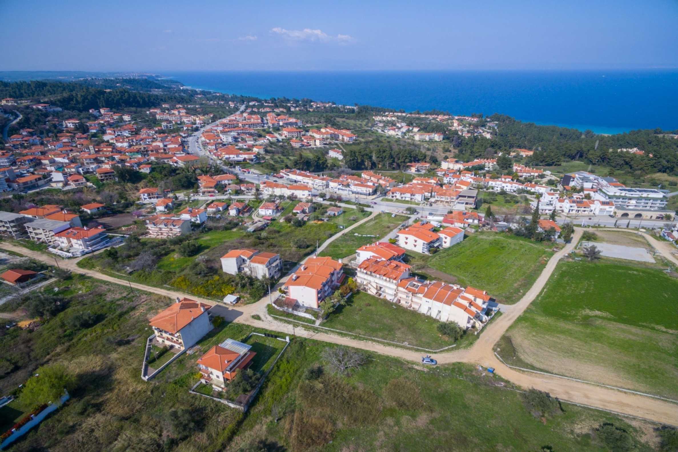 Наклонен парцел, 354 кв.м, в Касандра, Халкидики с безпрепятствен постоянен изглед и с източна ориентация. Имотът е на 600 м. от центъра на селото. Ограденият парцел е завършен, застроим и коефициентът му на застрояване е 0,6 (може да се построи 212 кв.м).