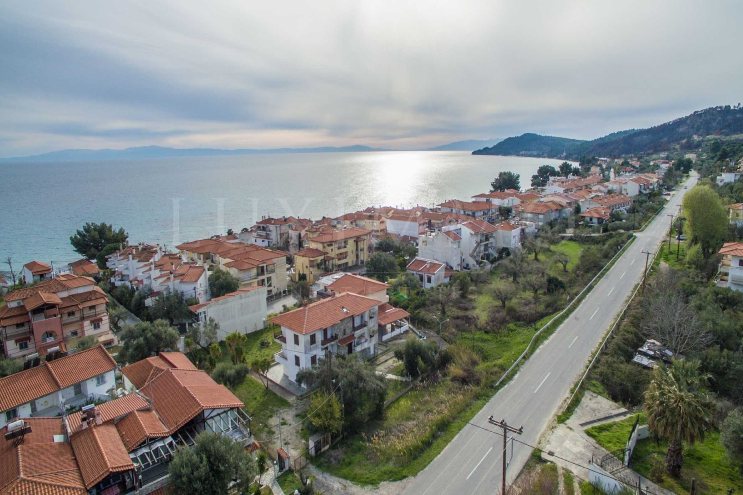 Ъглов парцел, 880 кв.м, в Касандра, Халкидики с безпрепятствен постоянен изглед и с източна ориентация. Ограденият имот е само на 130 м. от плажа и с лице към главния път. Парцелът, който има маслинови дървета, е завършен и застроим (може да се построи 400 кв.м).