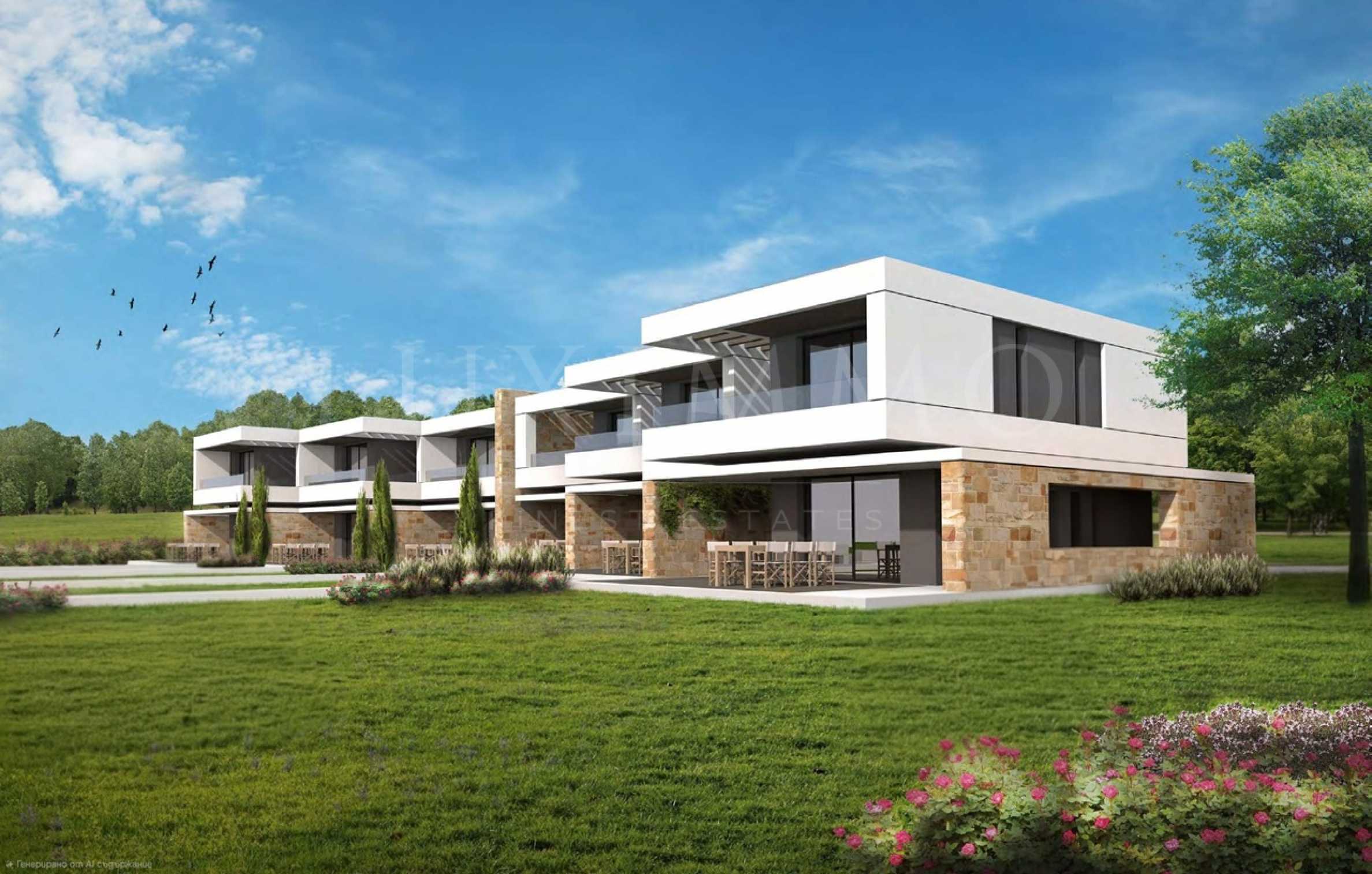 Комплексът е проектиран с фокус върху високите стандарти на обитаване и богатата инфраструктура. В южната част са ситуирани два басейна – голям за възрастни и детски, а в западната част, до входа, е предвиден собствен тенис корт. Вътрешната комуникация се осъществява чрез централен околовръстен път, който отвежда до дискретно разположени паркоместа (по две за всяка къща), интегрирани сред богато озеленени площи. В момента сградите са на етап „груб строеж“, което дава възможност на бъдещия собственик да завърши проекта съобразно своите изисквания – било то като луксозен хотелски комплекс или като ваканционно селище за индивидуални продажби.