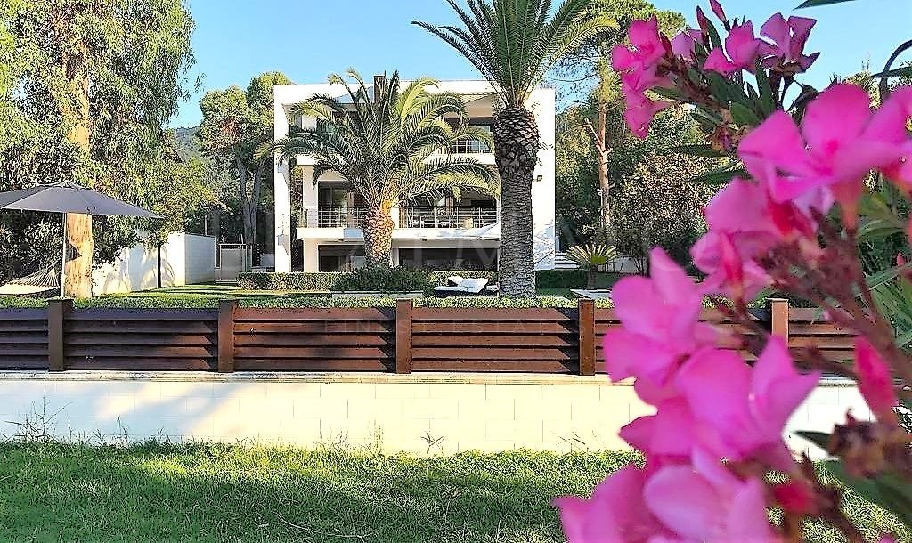 Луксозна вила 1-ва линия във Вурвуру, Ситония, Халкидики - неповторимо място за ваканционен имот в Гърция. Крайбрежната вила е с площ 400 кв.м и е построена върху парцел от 1500 кв.м, двора е добре поддържан и е осеян с екзотична растителност. Имотът се намира в най-престижния район на Ситония, пред красив пясъчен плаж във Вурвуру, предлагащ невероятна гледка към морето и остров Диапорос. Вилата е изградена на три нива с 6 двойни спални, всички със собствена баня, една основна всекидневна и две кухни. На приземния етаж се разполагат едната кухня, две спални, баня и склад. Първият етаж включва всекидневна, кухня, трапезария, хол, баня и спалня със самостоятелна баня. Вторият етаж се състои от две спални, всяка със самостоятелна баня и родителска спалня с размер 60 кв.м със самостоятелна баня с вана и изглед към морето. Вилата е напълно обзаведена и оборудвана с всичко необходимо за вашата почивка. Имотът е напълно климатизирана с централна отоплителна система, което дава уникално предимство за обитаването на къщата през цялата година. Разполага със слънчеви колектори, алармена система и камери за наблюдение, смарт телевизори, сателитна телевизия, DVD и wi-fi интернет.