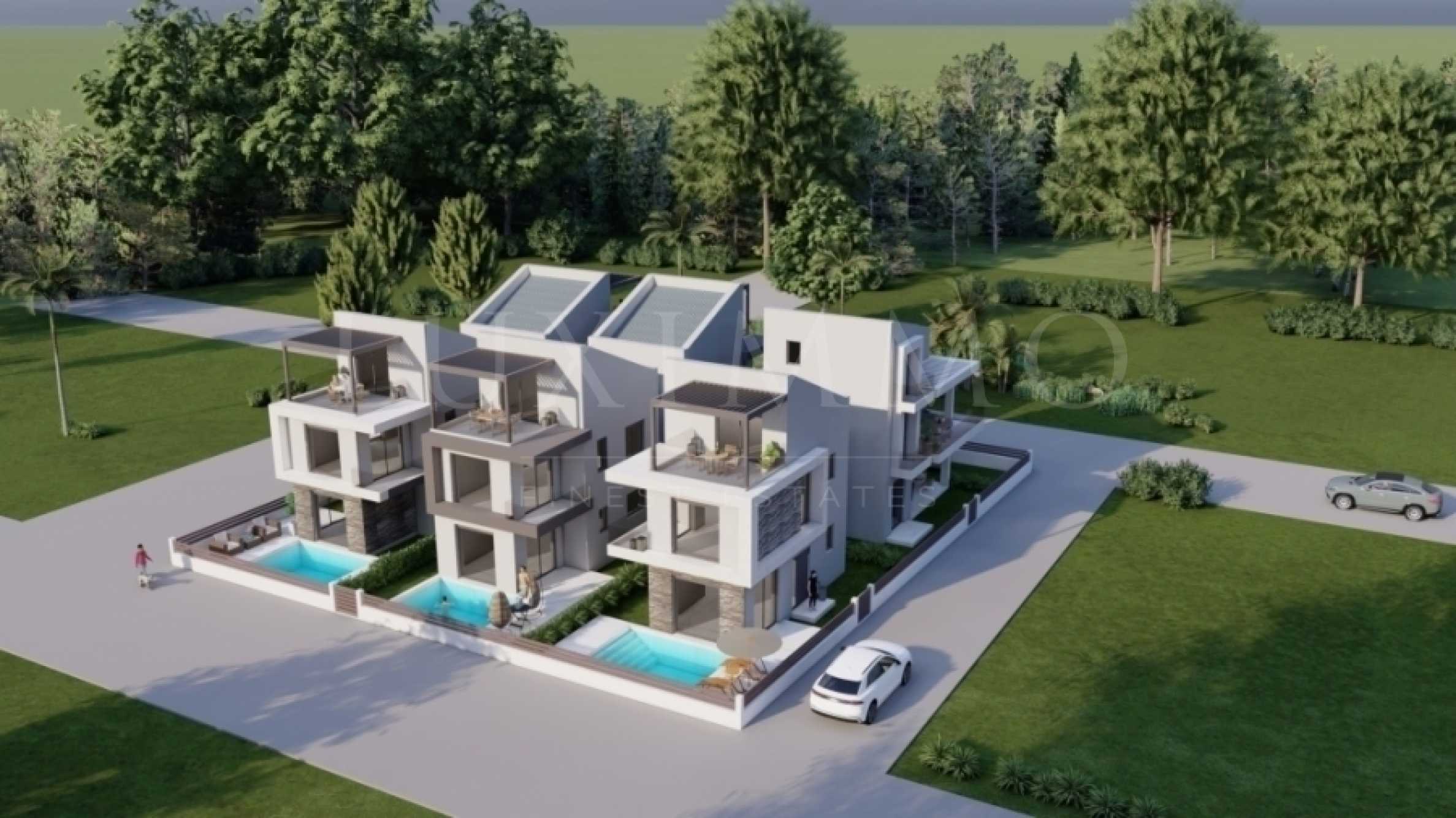 • 5 мезонета 105.8 кв.м. които се състоят от хол с кухня, трапезария, 3 спални, 2 бани и собствен басейн.