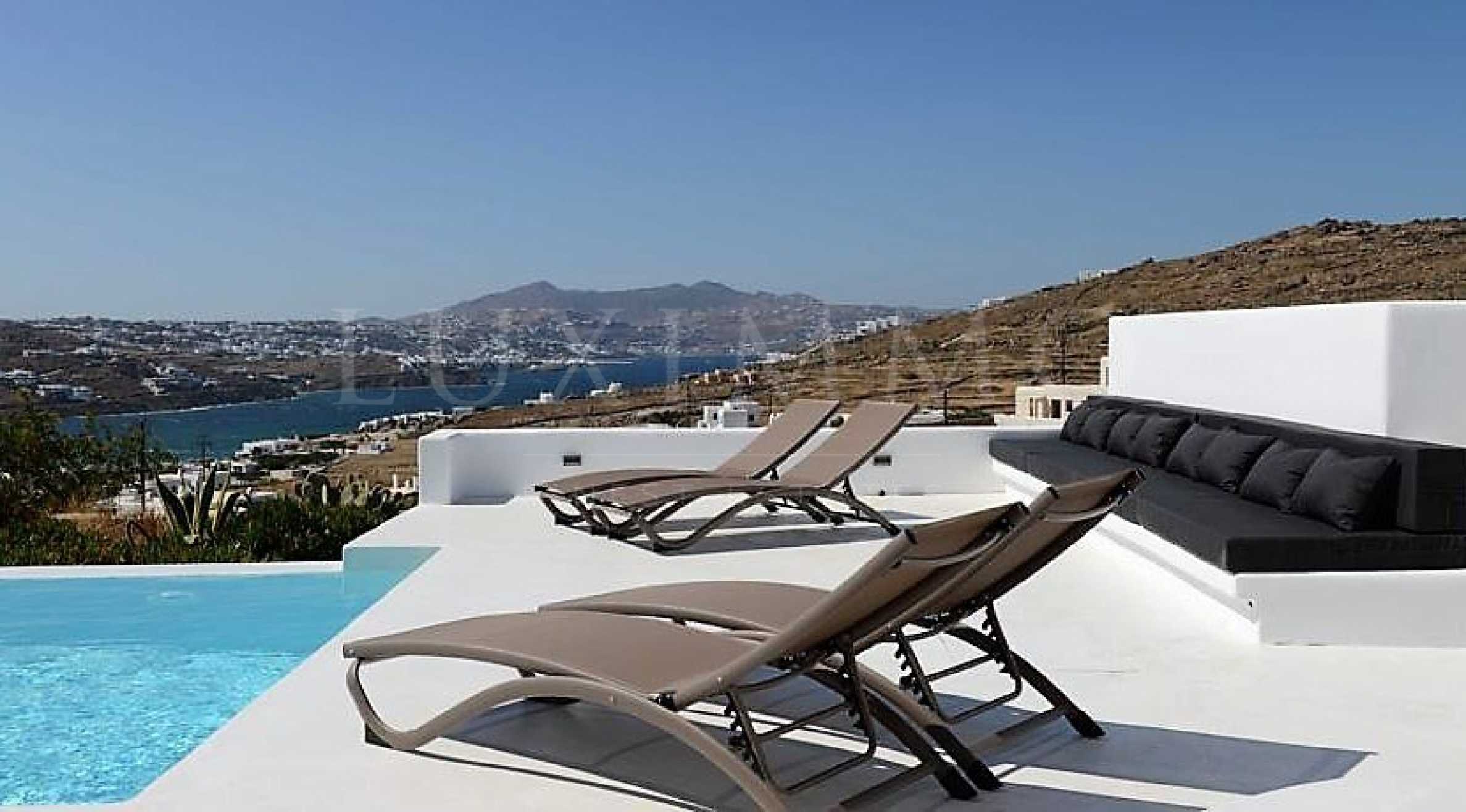Вила в комплекс, построен на амфитетарален парцел с площ 5500 кв.м., разположен в района на залива Орнос, остров Миконос, в близост до плажа и безпрепядствена, панорамна морска гледка.