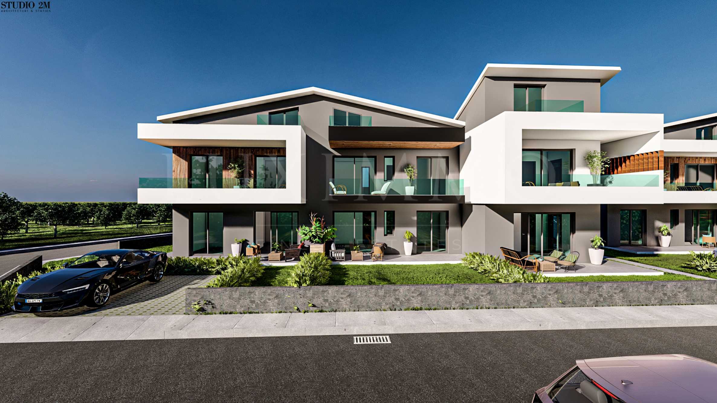 • апартаменти с две спални от 56.68 кв.м до 68.76 кв.м с разпределение, включващо всекидневна, две спални, две бани и две тераси.