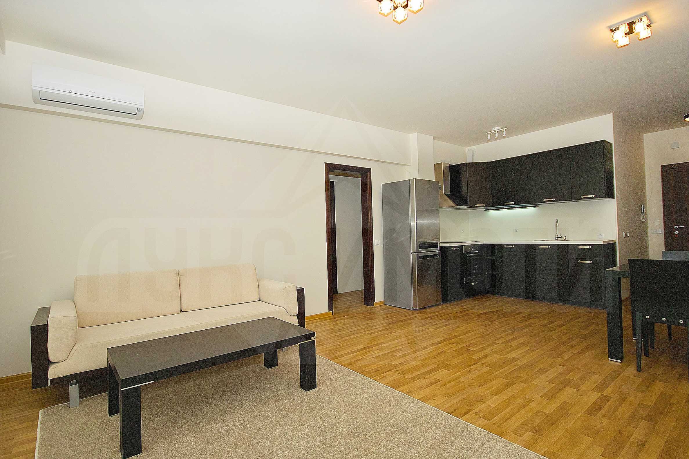Разпределението включва хол с кухненски бокс и тераса с гледка към Витоша, две спални, едната от които с баня с вана и отделна баня. Отоплението е на котел на газ, като и във всяка стая има климатици. Южното изложениепредлага прекрасни гледки към Витоша. Сред предимствата на имота е това, че е част от затворен комплекс с удобства и охрана. Към апартамента има и гараж на цена от 15,000 Евро