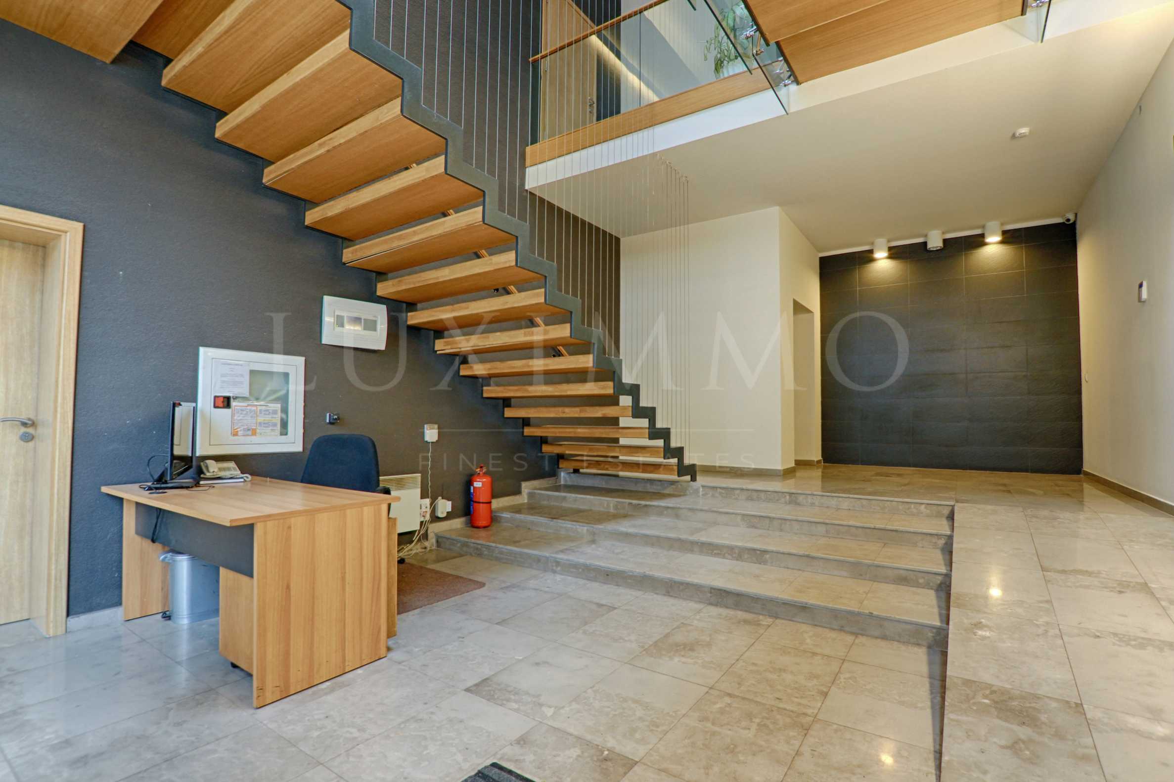 Офисът заема първи надпартерен етаж от общо осем за сградата. Изложението е юг/север. Помещенията са с високи тавани 3.80 м. Имотът се предоставя със следните довършителни работи: