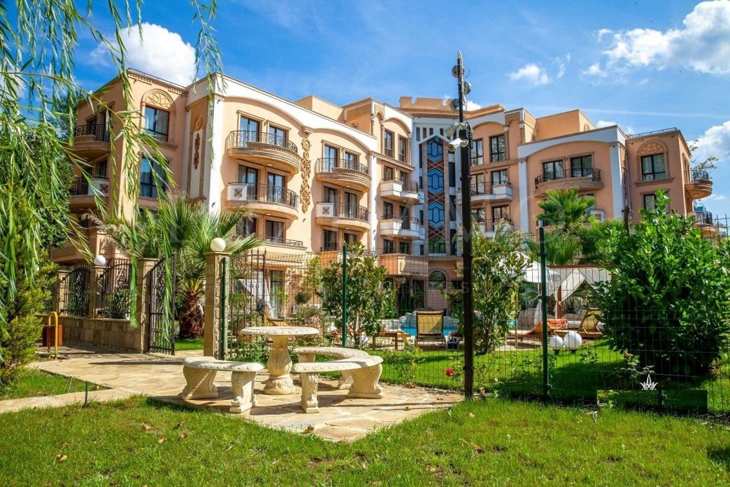 Апартаментът се намира в елитен комплекс от затворен тип в тих западен район на курорт Слънчев бряг, само на 400 метра от морето. Комплексът се радва на голяма, денонощно охраняема територия с два басейна и множество екстри, с които може да се запознаете в раздела "характеристика на комплекса". В непосредствена близост до комплекса има голям денонощен супермаркет.