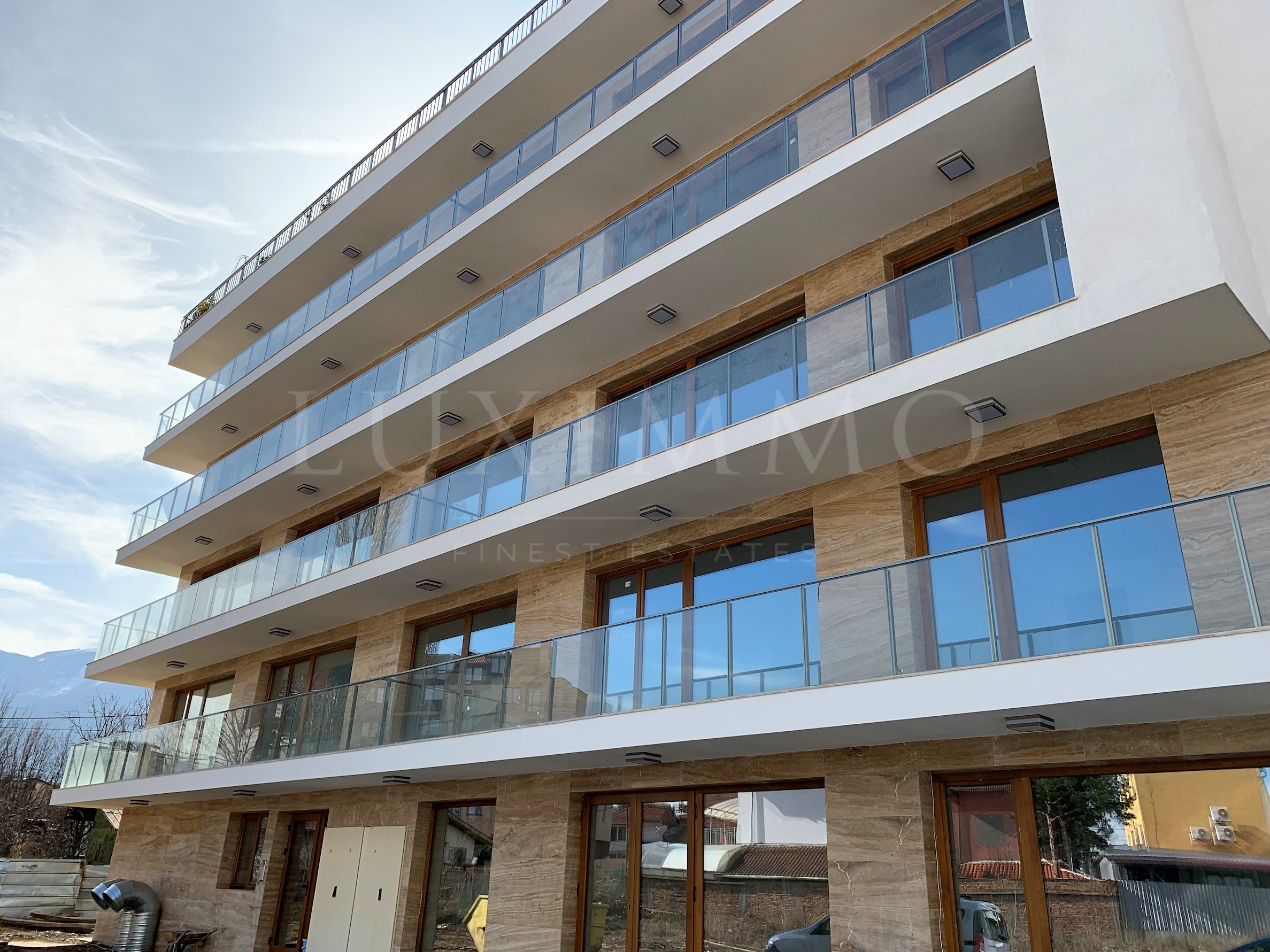 Сграда: Нова сграда с луксозни общи части и фасада от италиански травертин;