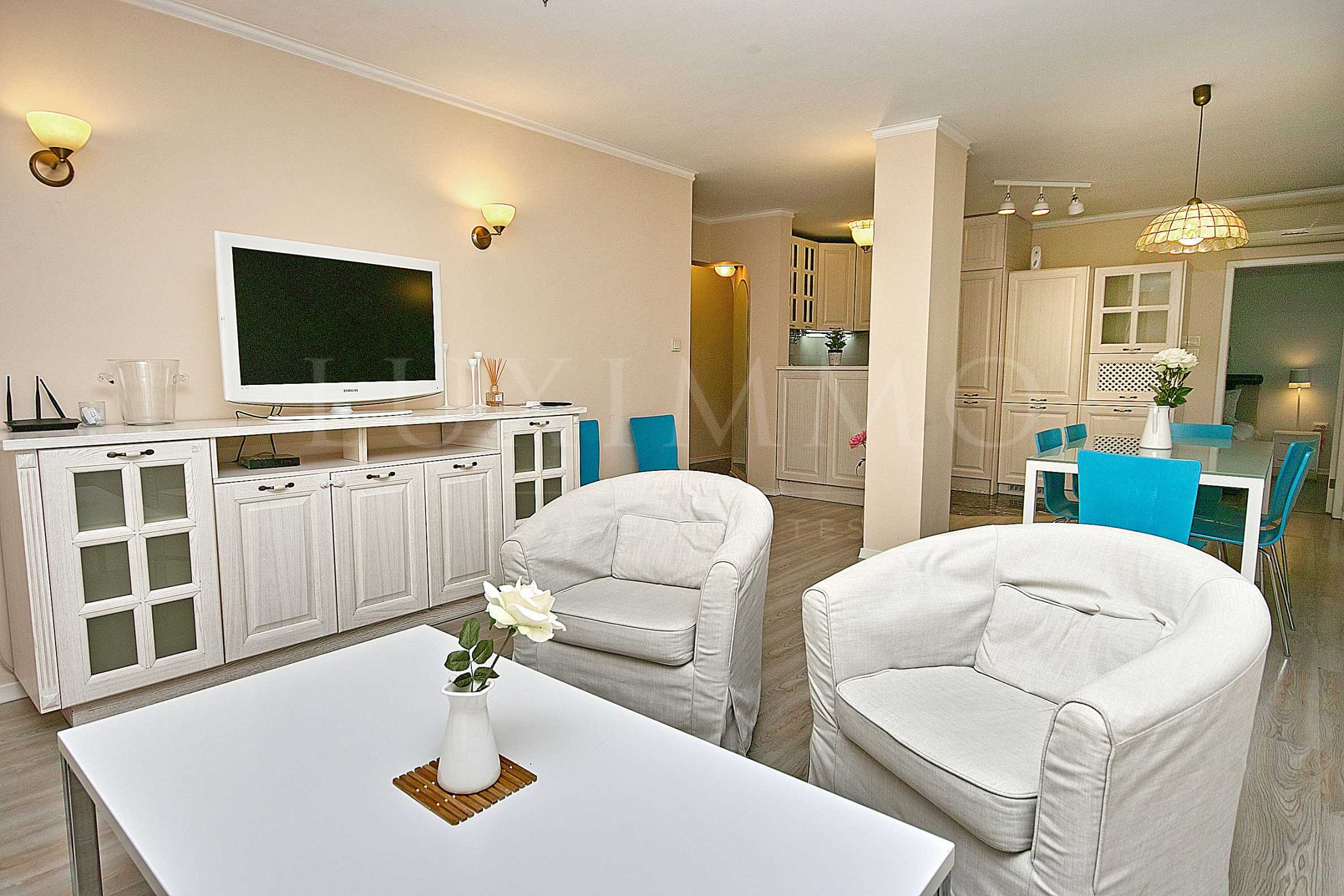 Апартаментът е напълно обзаведен с качествени и елегантни мебели, които му придават уют и приятна атмосфера. Кухнята е оборудвана с миялна машина, ел. печка, керамични котлони, аспиратор и хладилник с фризер.