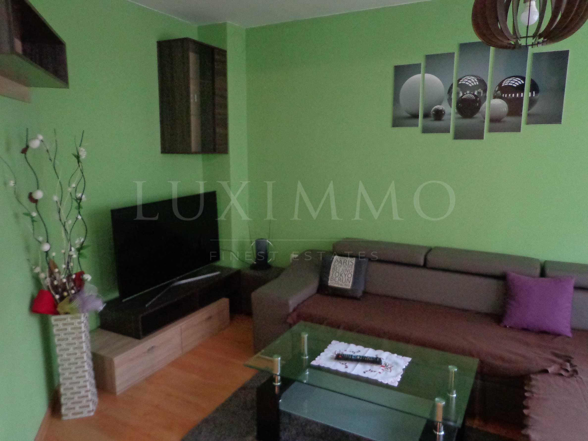 Апартаментът е с площ от 90 кв.м. Намира се на първи етаж над магазини в тухлена сграда. Разпределението на апартамента включва: входно антре,всекидневна с кухненска част, баня с тоалетна, дрешник, две спални и две тераси. Имотът се отдава под наем напълно обзаведен и оборудван и всичко необходимо за едно домакинство.