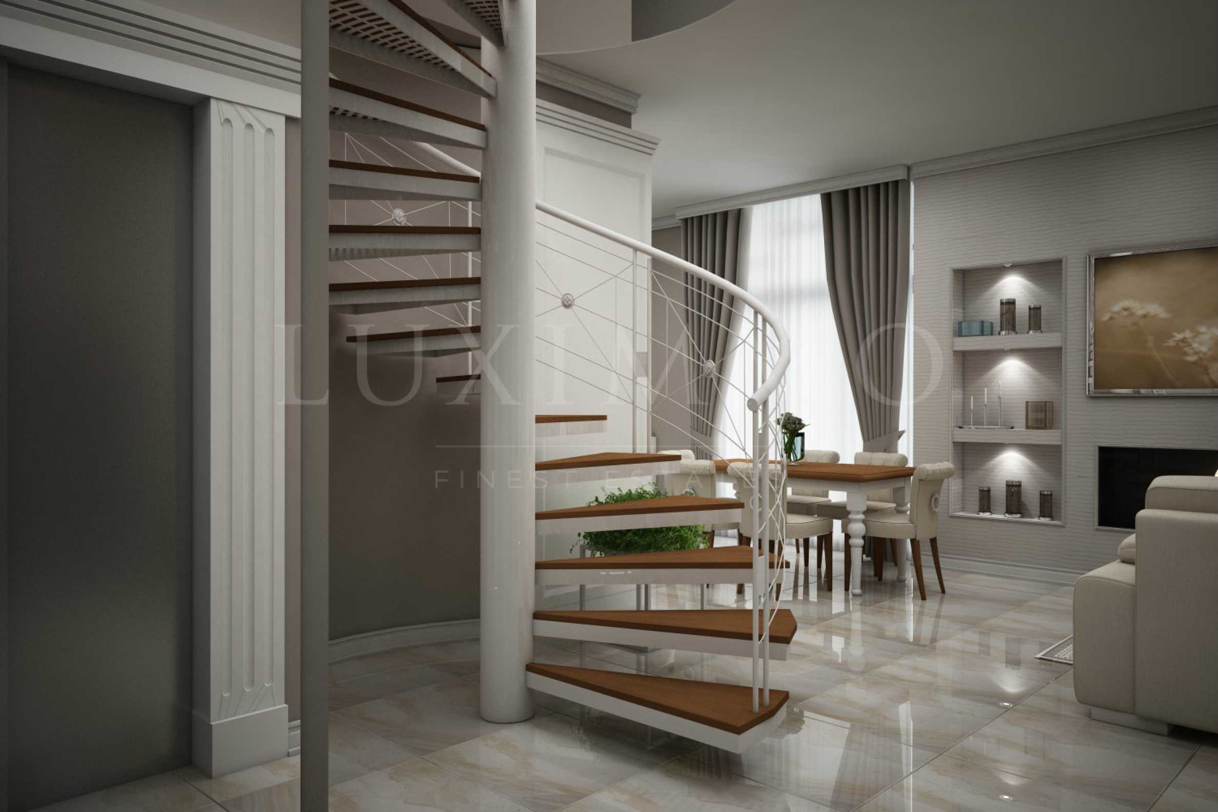 На първия етаж са разположени две ателиета, а на втори и трети етаж има по два апартамента - един с една спалня и един с две спални. На четвърти и пети етаж е голям апартамент с 2 спални и с кабинет на последния етаж към него, плюс 76 кв.м. открита панорамна тераса. Към апартамента има и сауна.