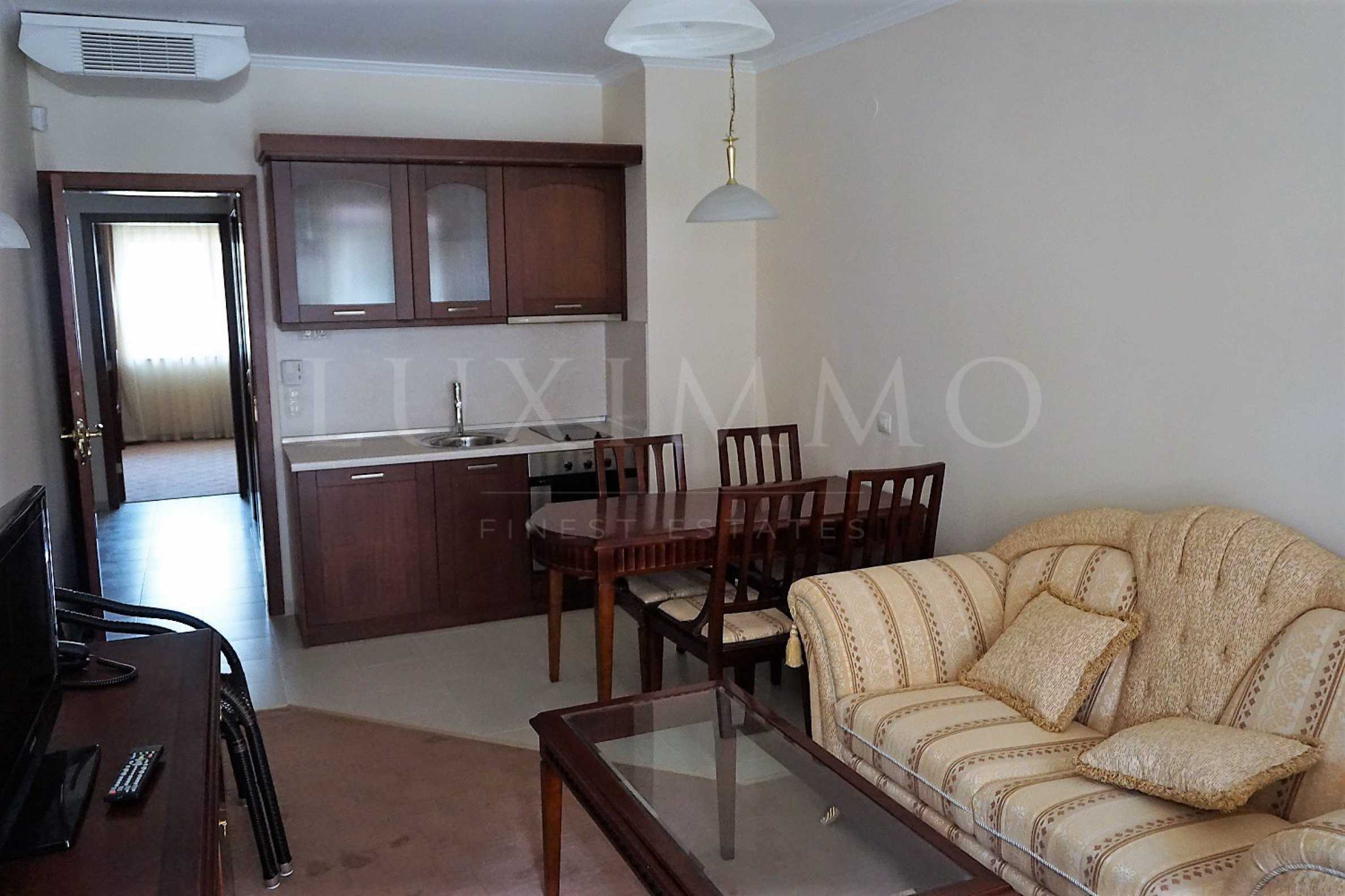 Кухнята е напълно оборудвана с керамичен плот, мивка, шкафове, котлони, фурна, хладилник, маса с три стола. Хол - с две кресла, диван, маса, телевизор, масивно бюро, климатик. Спалня - с двойно легло, две нощни шкафчета с лампи, гардероб, тоалетка с огледало, сейф, климатик. Баня с тоалетна - с вана, душ-кабина, мивка с огледало и бойлер, сешоар. Апартаментът разполага с един балкон. Отоплението е чрез електрически конвектори. Жилището е снабдено с телефон, интернет и кабелна телевизия.
