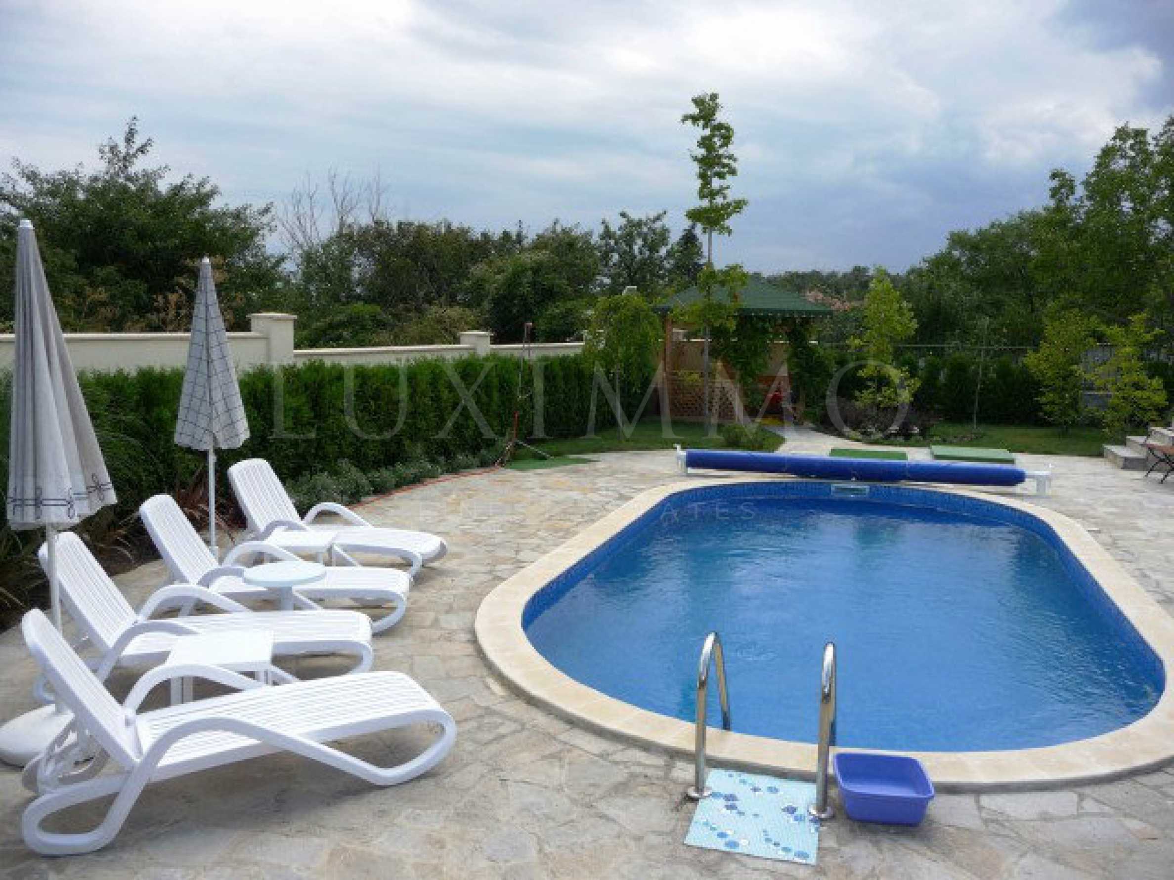 Собствениците разчитат на 24-часово видеонаблюдение и физическа охрана. На тяхно разположение са барбекю, басейн снабден със соларни панели, билярд, сауна и прекрасно оформена градина. Пътната инфраструктура до сградата е отлична.